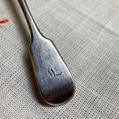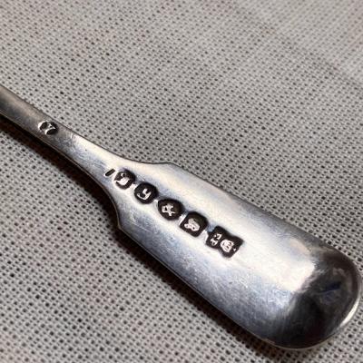 イギリスより可愛らしいマスタードスプーンが届きました【43-309】柄の部分には「W」と読めるイニシャル入り。裏面にはEPNS(シルバープレートの刻印)も刻まれています。EPNSとは「Electroplated Nickel Silver」の略でニッケルや銅などの上に電気を使って銀を施したものです。1842年にバーミンガムのエルキントン社で開発されたこの手法を使うことで、安価で美しく上部なシルバーアイテムが広がったそうです。イギリス製。