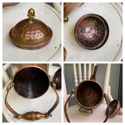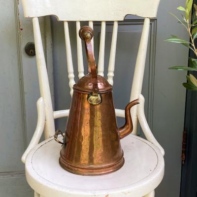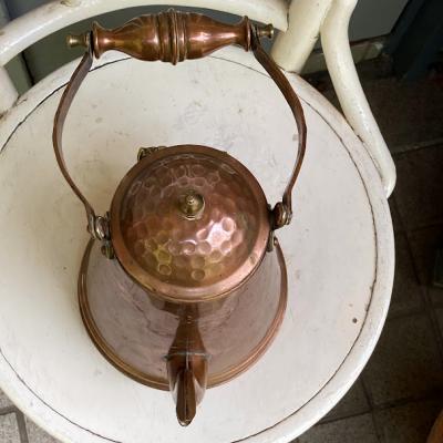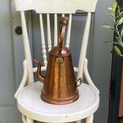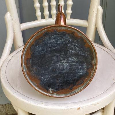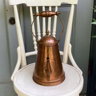 縦長の愛らしいコッパーケトルが届きました【43-405】ハンドル部分もすべて銅で出来ているので、焚火のお供などをしていたそうです。イギリス製、推定1930年代。後ろには持ち手があるので何かと便利に使えそうです。表面からはわかりませんが、内側をよく見ると注ぎ口の接続部をリペアした跡、何かペイントの跡のようなものが見られます。どのような素材を使ってあるかが不明なので、お湯を沸かすのはおすすめしません。そのまま飾ったり、観葉植物やドライフラワーを飾るフラワーべースとしてお楽しみください。上部のハンドルは可動式です。