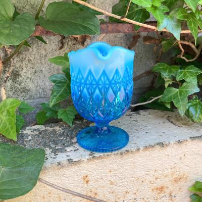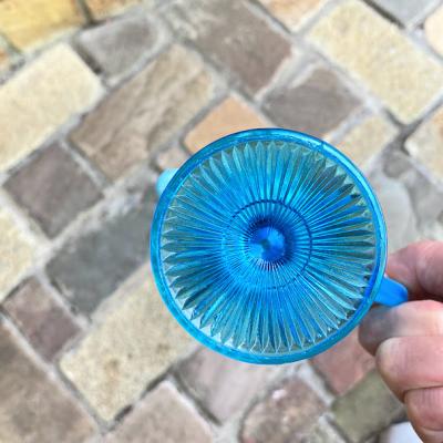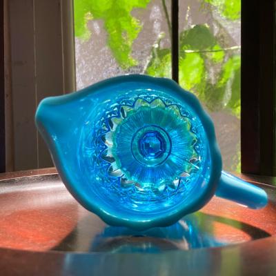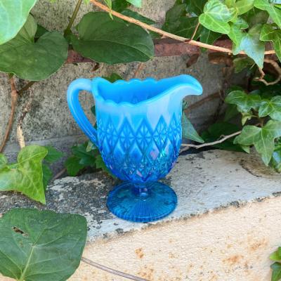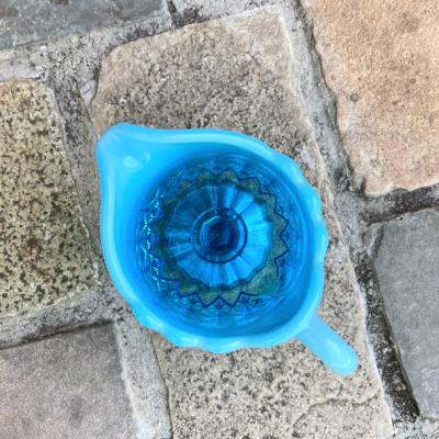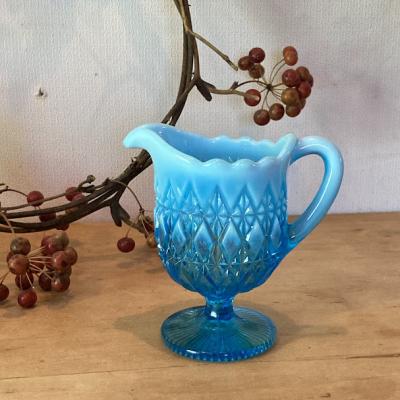 ブルーのグラデーションが美しい小さなジャグが届きました【41-134】こちらはジョージデビットソンが1867年に創業したガラスメーカーのものです。デビットソングラスは代表的なウランガラスをはじめ、数多くの作品が世界中のコレクターに愛されています。ヴィクトリア女王時代を代表するプレスガラスメーカーといわれています。見えづらいですが、内側の底に小さく「21777752」と刻印が入っており「Prince William」シリーズ1895年とのこと。古いガラスの特徴でもある製造時できた1mm以下の混入物がありますが、ダメージもなく非常にいいコンディションです。ぜひ光にかざして色の変化を楽しんでいただきたいお品です。アフタヌーンディーのミルク入れとしてはもちろんのこと、窓辺を彩るインテリアや、季節のお花を飾る花器として活躍することでしょう。★送料無料★