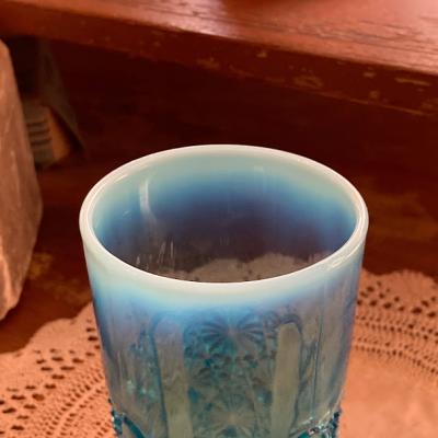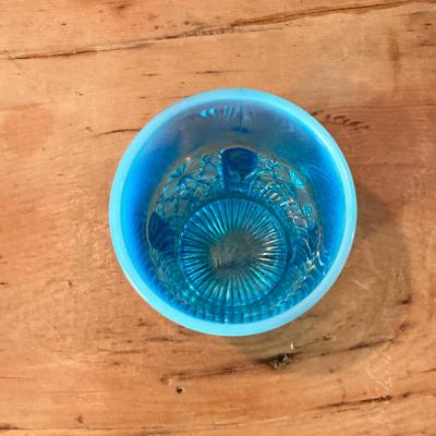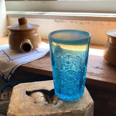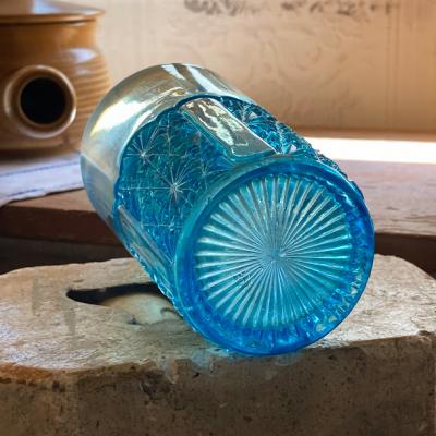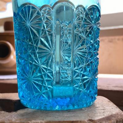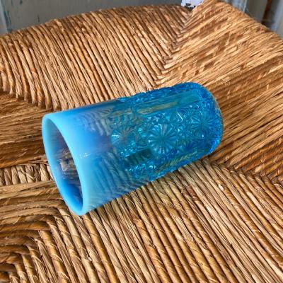 鮮やかなブルーのグラデーションが目を引くプレスガラスのコップが届きました【41-134】こちらはジョージ・デビットソンが1867年に創業したガラスメーカーのものです。デビットソングラスはウランガラスをはじめ、数多くの作品が世界中のコレクターに愛されており、ヴィクトリア女王時代を代表するプレスガラスメーカーといわれています。底に「176566」と刻印があり、1891年にデザインされたようです。フチの乳白色のガラスから下に向かってクリアガラスにつながる色合いが非常に美しく、ぜひ光にかざして色の変化を楽しんでいただきたいお品です。毎日使うコップとしてはもちろんのこと、窓辺を彩るインテリアや、季節のお花を飾る花器として活躍することでしょう。古いお品のため表面にアンティークらしい小さな傷やガラス内に気泡を含みます。福岡市南区の店舗にてお渡しもできますのでお気軽にどうぞ!