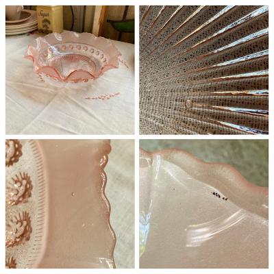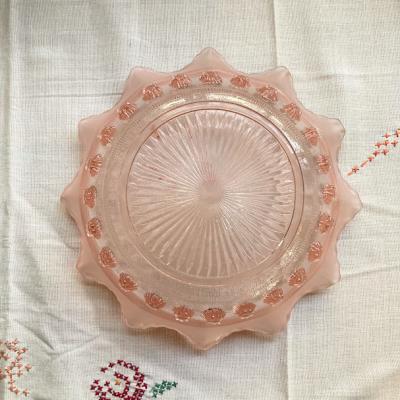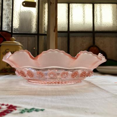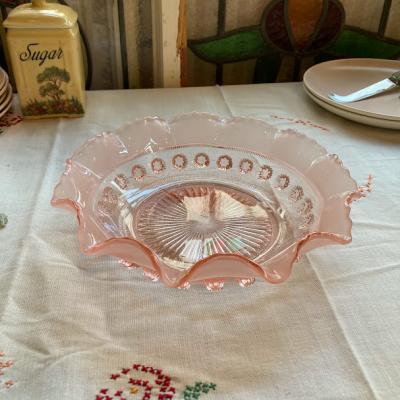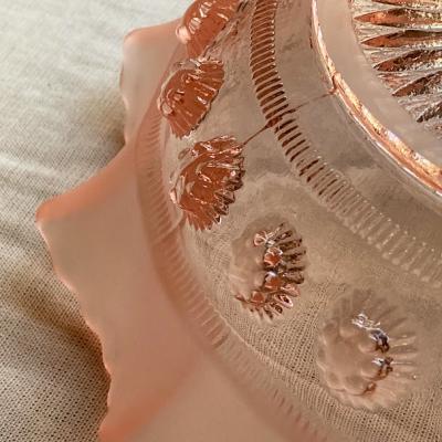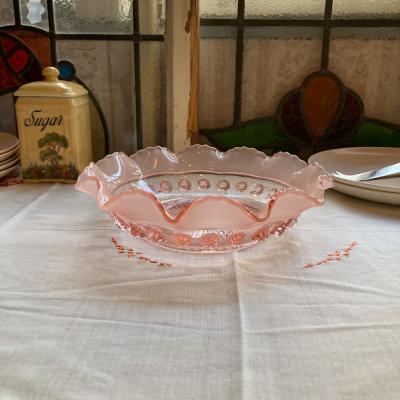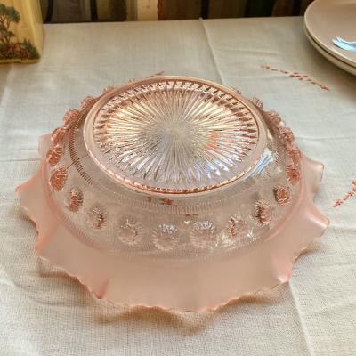 シェリーカラーに目を奪われるサービングボウル【41-335】こちらはジョージ・デビットソンが1867年に創業したガラスメーカーのものです。デビットソングラスはウランガラスをはじめ、数多くの作品が世界中のコレクターに愛されており、ヴィクトリア女王時代を代表するプレスガラスメーカーといわれています。Blackberry Prunt、1930年代。ガラスが重なり合う部分が光の当たり具合で美しく変化します。お料理を引き立てるのはもちろんのこと、窓辺を彩るインテリアや、季節のお花を飾る花器、アクセサリートレイとしても活躍することでしょう。古いお品のため表面に製造時に混入しているものや、ガラス内に気泡を含みます。
