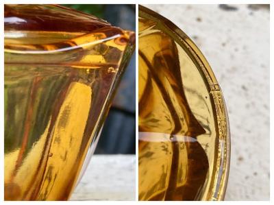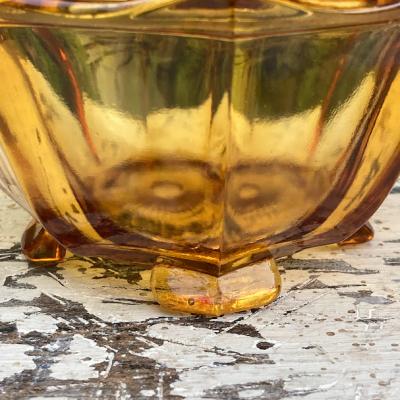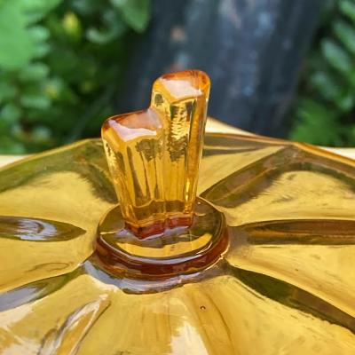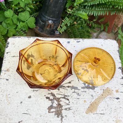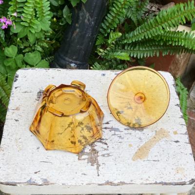 琥珀色のガラスがきらめくプレスガラスの容器が届きました。アールデコ調のデザインが目を引くお品です。推定1960年代。こちらはトリンケットセットと呼ばれるドレッサーに置いて使用するセットの中の一つとなります。組み合わせはいろいろあるようですが、ペアのキャンドルホルダー、蓋の付いた小物入れ、トレイ、リングホルダーなどをセットにしたものがあるそうです。このようなキラキラとしたガラスを前に、毎日の身支度を整えていたのかなぁ・・と思うと何だか楽しくなりますね。2個あるうちの大きなサイズとなります。古いガラスのため気泡を含みます。