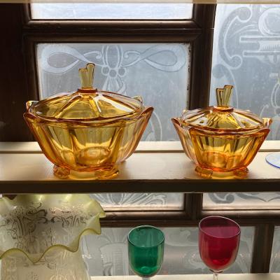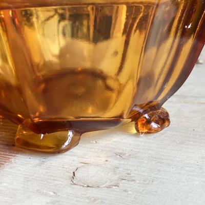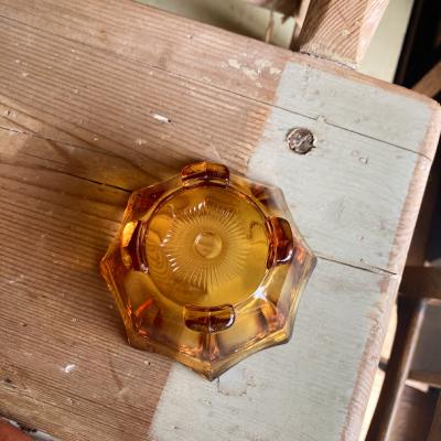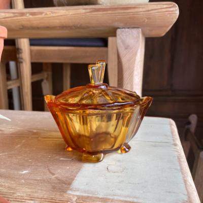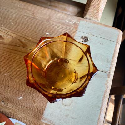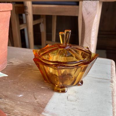 琥珀色のガラスがきらめくプレスガラスの容器が届きました【41-152-2】アールデコ調のデザインが目を引くお品です。推定1960年代。こちらはトリンケットセットと呼ばれるドレッサーに置いて使用するセットの中の一つとなります。組み合わせはいろいろあるようですが、ペアのキャンドルホルダー、蓋の付いた小物入れ、トレイ、リングホルダーなどをセットにしたものがあるそうです。このようなキラキラとしたガラスを前に、毎日の身支度を整えていたのかなぁ・・と思うと何だか楽しくなりますね。2個あるうちの小さなサイズとなります。写真の古いコインは500円玉と同じくらいの大きさのものを入れてあります。古いガラスのため気泡も含みます。