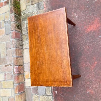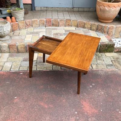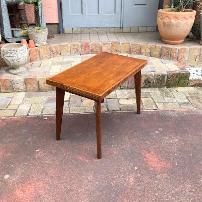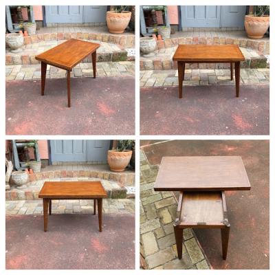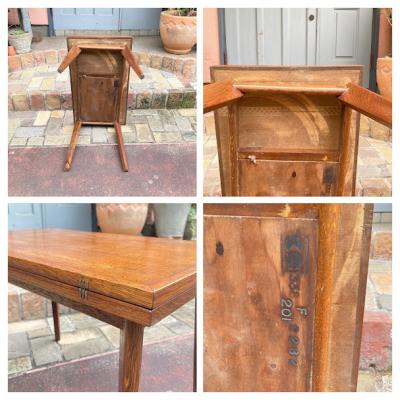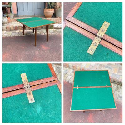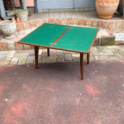 小さな折りたたみ式のゲームテーブルが届きました【43-150】天板を90度スライドすると一回り大きなテーブルに早変わりします。内側の天板には緑のフェルトが貼られており、カードゲームがしやすいように工夫されています。ゲーム以外にもシンプルなローテーブルとして活躍します。上にクロスをかければ、急なお客様でも天板を広く使えるので安心してお迎えできますね。天板の下は小さな収納になっているので、カトラリーや日常使いの小物を収納できます。チーク材、推定1960年代、イギリス製。福岡市南区の店舗にてお渡しもできますのでお気軽にどうぞ!