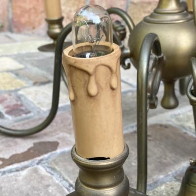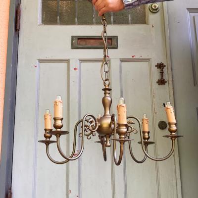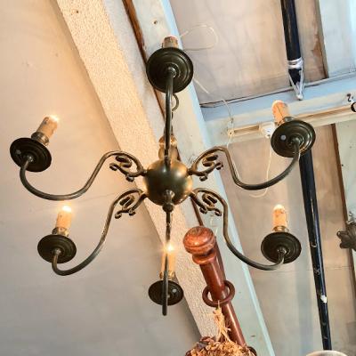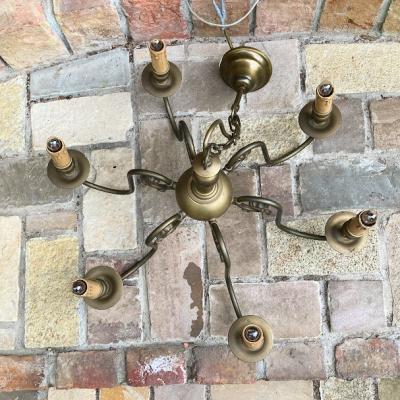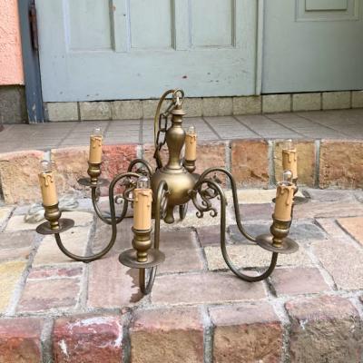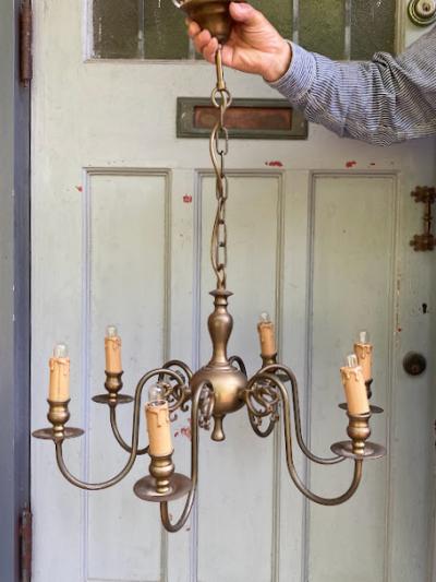 すっきりしたデザインの6灯シャンデリアが届きました【32-119】フランス製、推定1940年代。1本1本に馬のモチーフが施されています。天井カバーの根元は、約5㎝ほど上下に調整ができるので高さ調整も簡単です。コードの先端は展示のためにコンセントプラグを付けてありますが、ご自宅や店舗用に角型シーリングへと無料で変更できます。コードの長さ調整もできますのでお気軽にお申しつけください。電球は点灯確認用の口金サイズ:E14白熱球25Wを使用して撮影していますが、お好きな電球に交換してお楽しみください。福岡市南区の店舗にてお渡しもできますのでお気軽にどうぞ!