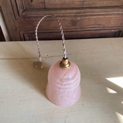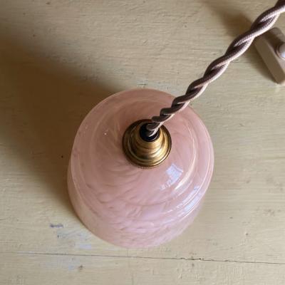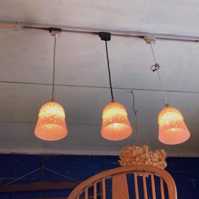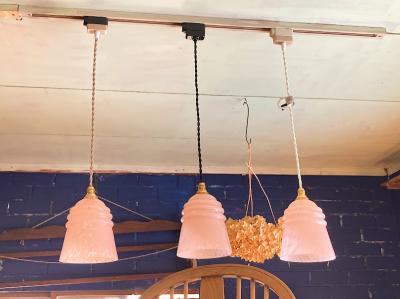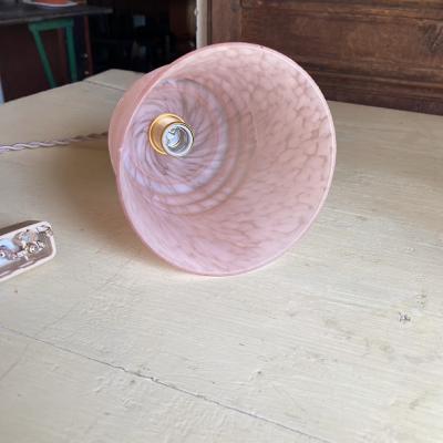 さくらの花びらを思わせる優しい色合いのガラスシェードが届きました。イギリス製、推定1950年代。透明と淡いピンクのガラスが重なり合うことで美しいグラデーションを見せてくれます。昼間は淡い桜色を楽しみ、灯りを燈した時にはほっと温かみのある空間を演出してくれますよ。珍しく同じデザインのシェードが゙3個揃ったので、並べて吊るしても素敵ですよ。こちらは1個あたりの販売です。品番【43-466A】。外側はツルツルした質感ですが、内側はツヤなし、ガラス内部には気泡を含みます。