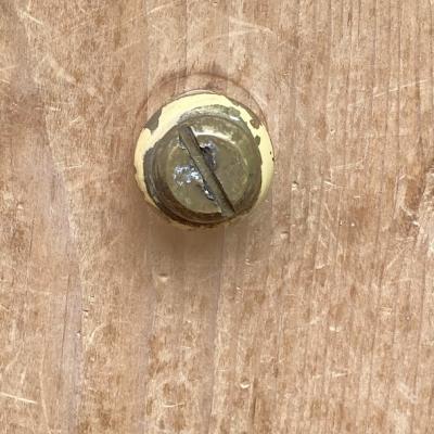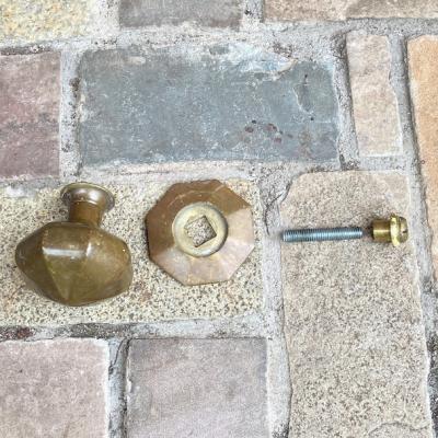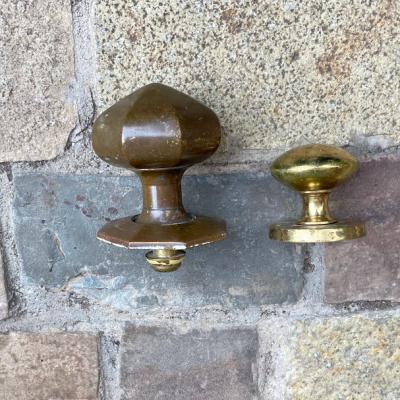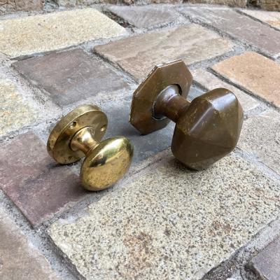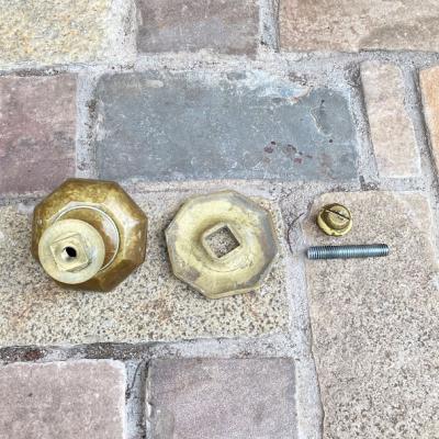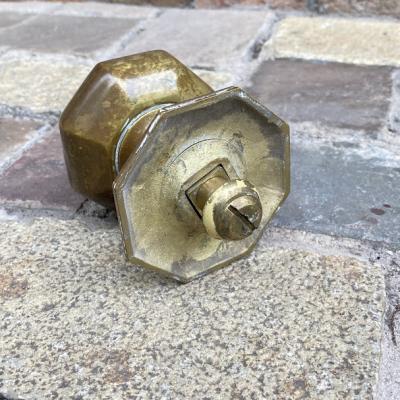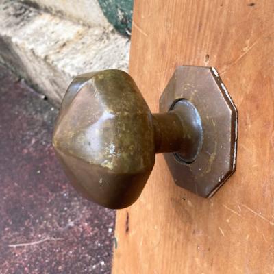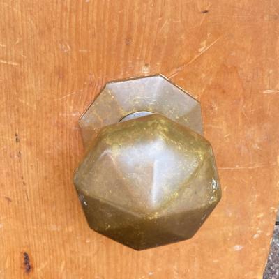 イギリスでは見かけることの多いセンターノブが届きました【41-25】こちらは縁起のよいと言われる八角形をベースにした形です。同じようなデザインのものを出品していますが、ややサイズが小さなタイプです。一般的なサイズのノブと比べると、その大きさに驚きます。イギリスの首相官邸や教会など歴史的な建物によく使われており、ぐっと力を入れて押し開けるため大きめのサイズになっているそうです。ずっしりと重量感のあるたたずまいは、取り付けたドアをインパクトのある姿に変えてくれるでしょう!イギリス製、年代不詳。