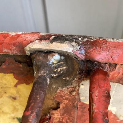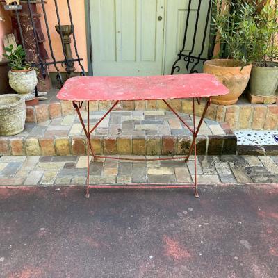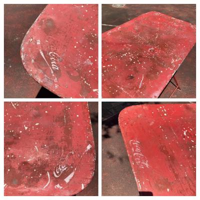 コカ・コーラの歴史を感じさせるビンテージ折りたたみテーブルが届きました【43-167】天板には数か所Coca-Colaのロゴの上下にフランス語でBUVEZ(ドリンク・飲み物)MARQUE DEPOSEE(登録商標)の文字が刻まれています。現地セラーによると推定1950年頃に作られたというこのテーブルは、脚をスライドさせることでコンパクトに収納できる優れたデザイン。ペンキ剥がれやサビ凹凸などは、このテーブルが長い年月を経てきた証です。ジャンクな雰囲気が好きな方や、レアなコカ・コーラグッズをコレクションしている方におすすめです。