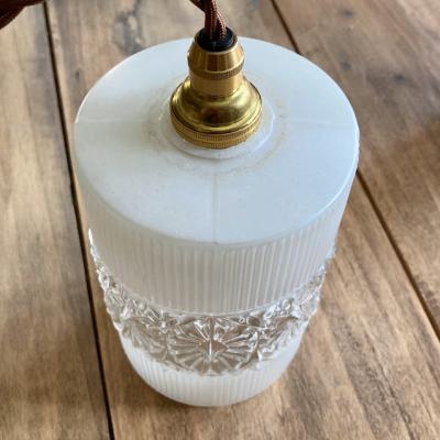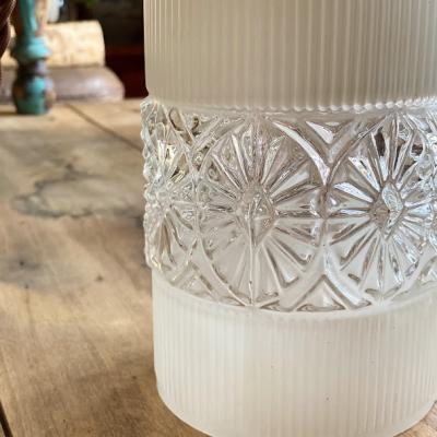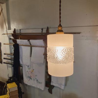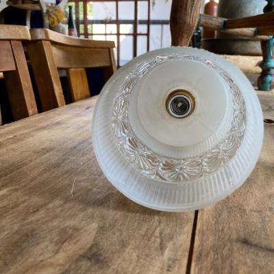 レトロな雰囲気のガラス照明が届きました【43-160】イギリスで買い付けしましたが、何だか懐かしい感じの照明です。プレスされ立体感のあるデザインが光を反射しキラキラと壁面を照らしてくれます。派手すぎないたたずまいが和風にも洋風にも合いそうですね。年代不詳。
