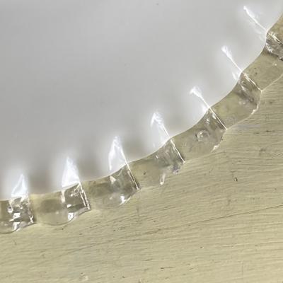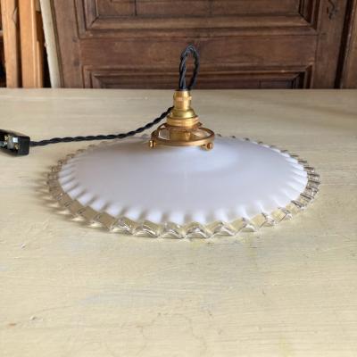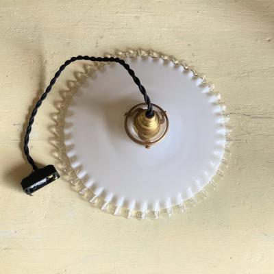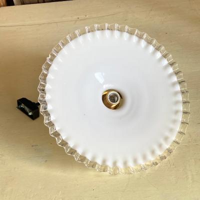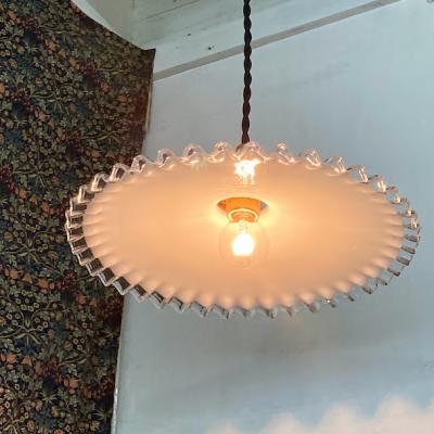 フレンチインテリアにピッタリなミルクガラスシェードが届きました【43-D】フチの透明フリルが可愛らしいくどんなお部屋でも使い勝手のよいシェードです。古いガラス特有の小さな凹みや気泡、製造時に入り込んだ小さな黒い粒を含みます。現地の職人が一つ一つ作り上げたもので、フリルの角度や全体の印象がすべて違います。この照明は少し平らな印象でフチに1カ所だけ3mmほどのカケがあります。かなりしっかり見ないと分からないレベルですが、その分を価格に反映させてあります。
