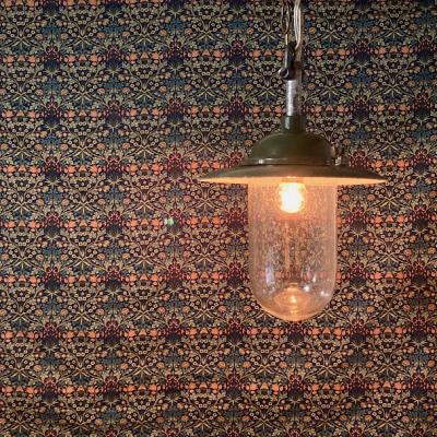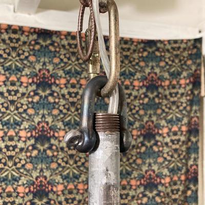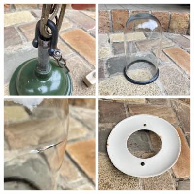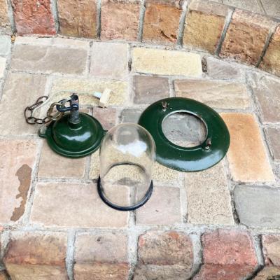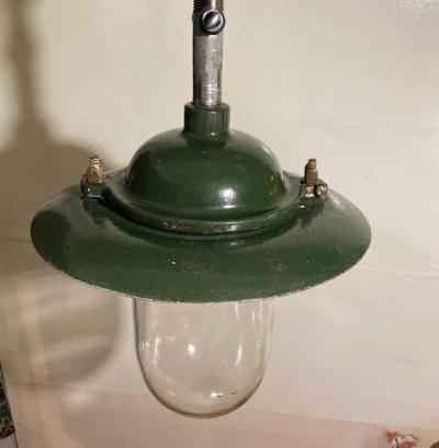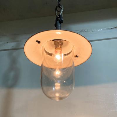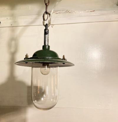 フランス製のガレージやアトリエ店舗などにぴったりなインダストリアルデザインの照明が届きました【36-268】推定1940年代。重量約2キロ。ゴツゴツした雰囲気がカッコいい空間を演出します。残念ながら透明ガラスの一部分にうっすらと亀裂が入っているため、お求めやすい価格にしてあります。すぐに割れてしまう感じではありませんが、画像にてしっかりとご確認ください。口金はオリジナルのB22を使用。コード、角型シーリングは新しいものと交換済みです。電球の交換は上に付属しているネジ2か所を外すと簡単に分解できます。上には古いチェーンがあり長さ調整が簡単にできるように加工してあります