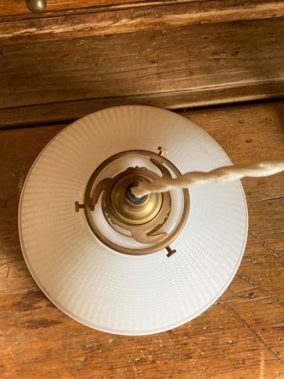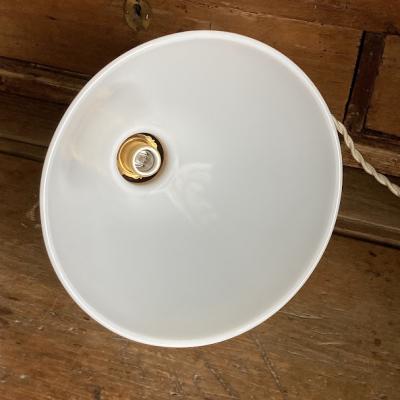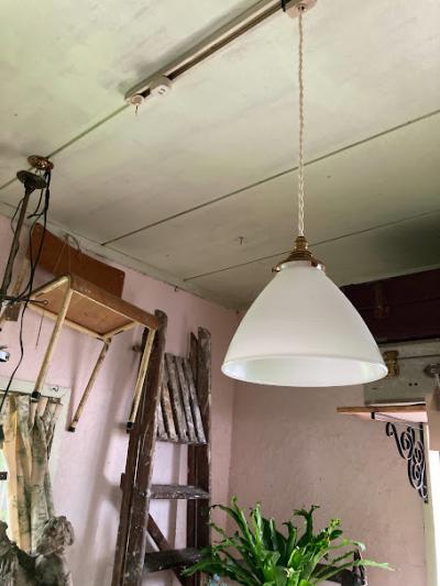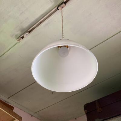 口金は日本仕様の新品に交換済み。口金サイズE17サイズの電球でLED電球にも対応します。コードはホワイト、ブラウン、ブラックの3色から、長さ50㎝まで調整いたします。撮影時には白熱球(電球色25W)を使用しているためオレンジぽい色合いに見えます。シンプルなデザインなので、カフェやダイニングなど、お客様をおもてなしする癒しの空間におすすめ。福岡市南区の店舗にてお渡しもできますのでお気軽にどうぞ!