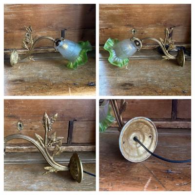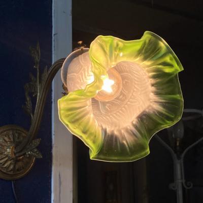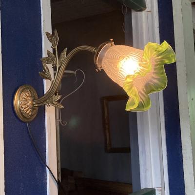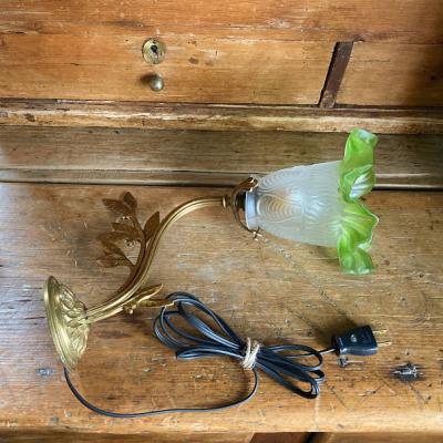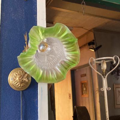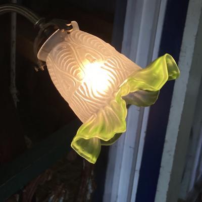 爽やかなグリーンのシェードをまとったウォールランプが届きました【40-30】フランス製、推定1930年代。壁から曲線を描く優雅なデザインは、空間を華やかに演出してくれます。壁掛けを想定していますので、コードの長さは通常よりも長い約150㎝を付属していますが、リフォームなどで壁面内にコードを設置される方には短くしてお届けもできます。お気軽にお申しつけください。口金はオリジナルの海外仕様のものを付属。口金サイズB22の電球をご利用ください。土台部分には固定用の穴が2か所あります。福岡市南区の店舗にてお渡しもできますのでお気軽にどうぞ!