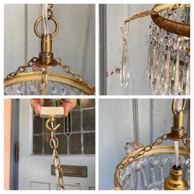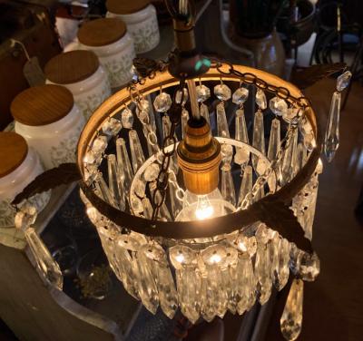 ガラスの輝きが空間を彩る、フランス製のシャンデリアが届きました【44-76B】最大直径約25cmと片手で簡単に持ち運びできるサイズ感ですが、四方に伸びた羽根のようなデザインに加え、キラキラと煌めく佇まいがとても魅力的です。1940年代。日本の電球(口金サイズE17)が使用できるように交換済み、LED電球も使えます。角型シーリングにはフックを付属しているため、、チェーンで簡単に長さ調整が可能です。お部屋に華やかさと優雅さを添える、素敵な照明をお探しの方におすすめ。一つ一つのパーツはワイヤーで引っ掛けてあるだけなので、輸送時に外れることがあります。福岡市南区の店舗にてお渡しもできますのでお気軽にどうぞ!