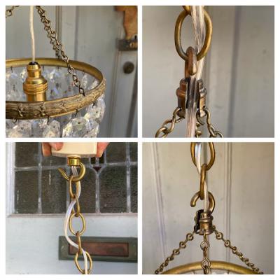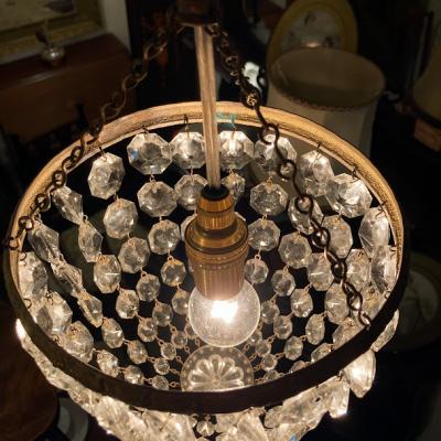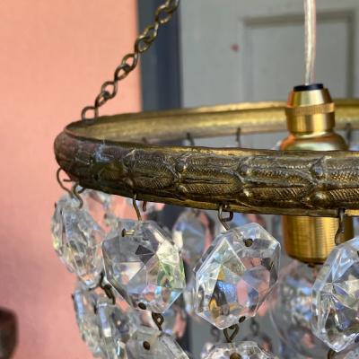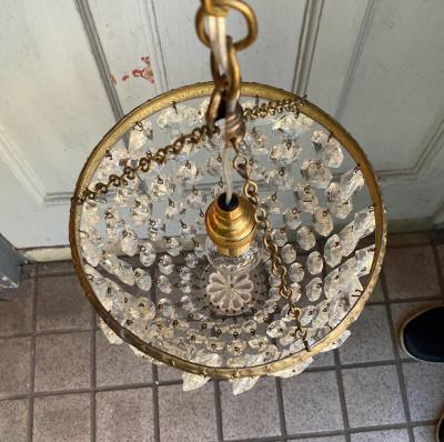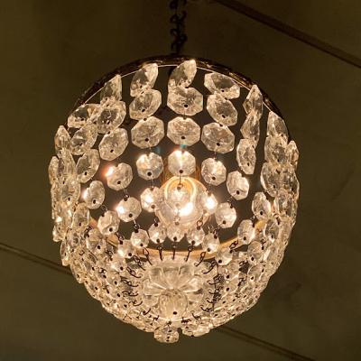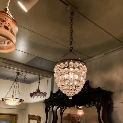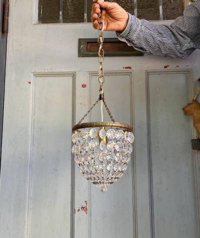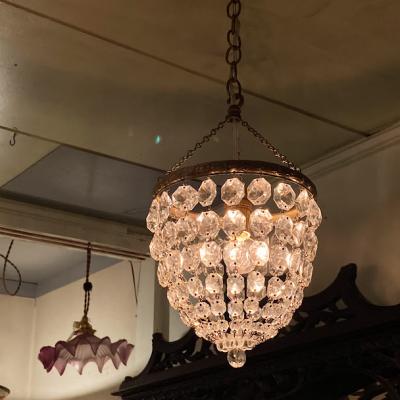 ガラスの輝きが空間を彩る、フランス製のシャンデリアが届きました【44-76C】直径約18cmと片手で簡単に持ち運びできるサイズ感ですが、キラキラと煌めく佇まいがとても魅力的です。1940年代。日本の電球(口金サイズE17)が使用できるように交換済み、LED電球も使えます。角型シーリングにはフックを付属しているため、、チェーンで簡単に長さ調整が可能です。お部屋に華やかさと優雅さを添える、素敵な照明をお探しの方におすすめ。一つ一つのパーツはワイヤーで引っ掛けてあるだけなので、輸送時に外れることがあります。こちらは同じデザインの物を出品しておりますが、商品番号が違いますので画像をご確認ください。違いが分かるように、こちらはクリア電球を取り付けてあります。福岡市南区の店舗にてお渡しもできますのでお気軽にどうぞ!