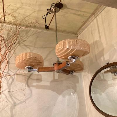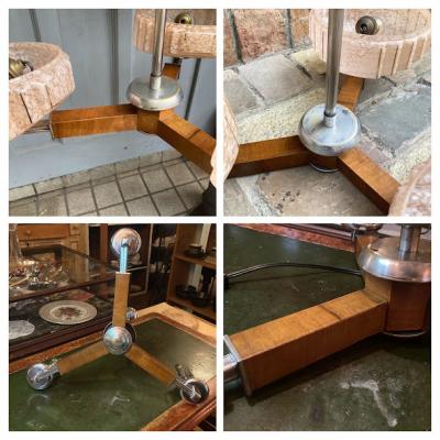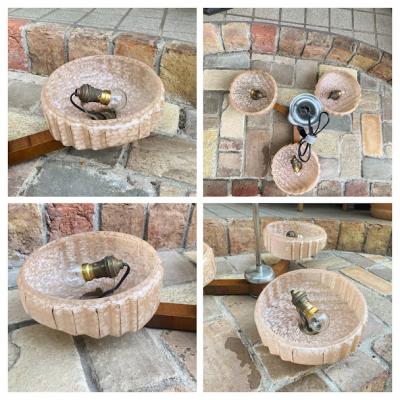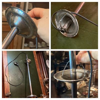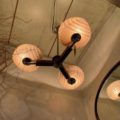 店舗では点灯確認用にコンセントを使用しており、天井のねじ止め用の穴を利用してワイヤーで吊り下げて撮影しています。3つのガラスシェードは簡単に取り外しができるので、発送の際には取り外して梱包します。電球は海外仕様の口金サイズ:B22を使用。1950年~60年代、イギリス製。メッキ部分に小さな傷やサビを含みます。コンセントプラグを角型引掛けシーリングに無料で交換できますのでお気兼ねなくお申しつけください。シンプルながらも存在感のある照明をお探しの方におすすめ。福岡市南区の店舗にてお渡しもできますのでお気軽にどうぞ!