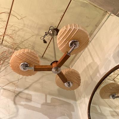 シンプルな3連のシャンデリアが届きました【44-115】光源が直接目に入らない仕様のため、リラックスできる空間を演出してくれますよ。サーモンピンクのガラスシェードにはゴールドのラインが施されておりいいアクセントになっています。ソケットカバーは天井にネジで固定する仕様になっているので、固定しないと棒の下の方へ落ちていきます。角型シーリングを取り付ける場合には、ソケットカバー内に収まらないため天井との間に隙間ができます。別の場所に角型シーリングかコンセントプラグを取り付けて、本体は別位置にフックなどで吊り下げる方法をとってもいいかもしれません。