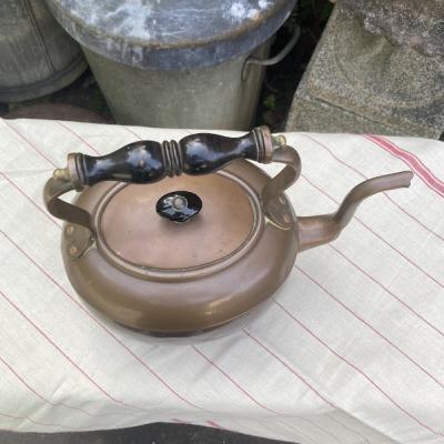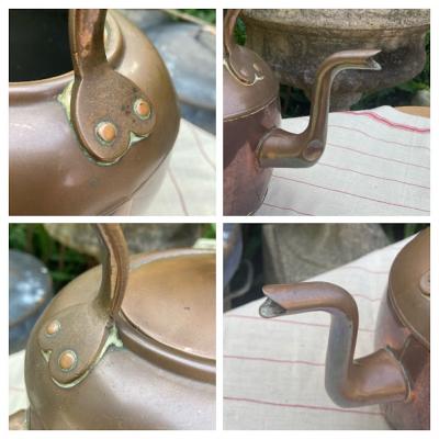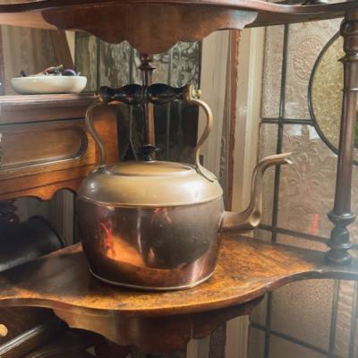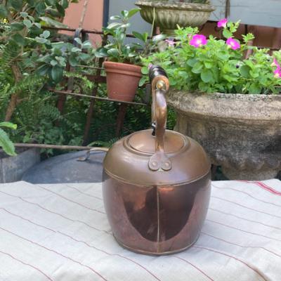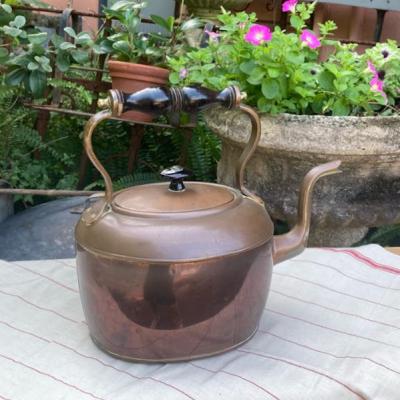 木製のハンドルがついたオーバルの素敵なケトルが届きました【4‐G】30分ほどのテストでは水漏れはなく、使い勝手が良さそうです。古い銅の特徴である緑青や継ぎ目に白い箇所ありますが雰囲気を残すためそのままにしてあり、軽く拭き上げるのみ行いました。ハンドルは動きません。注ぎ口のところに一部凹みがあります。イギリス製、推定1930年代。あくまでディスプレイ用として輸入しておりますので、お部屋のアクセントや水差し、撮影小物などでお楽しみください。福岡市南区の店舗にてお渡しもできますのでお気軽にどうぞ!