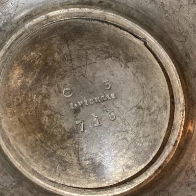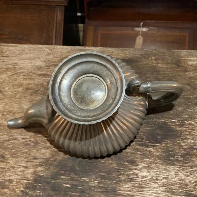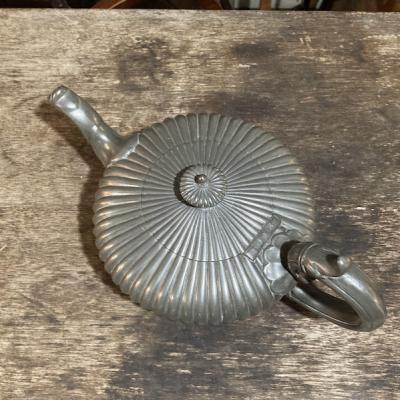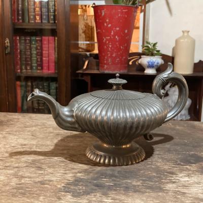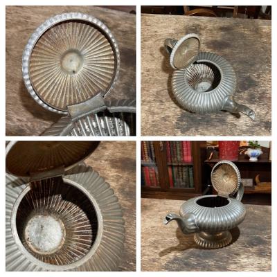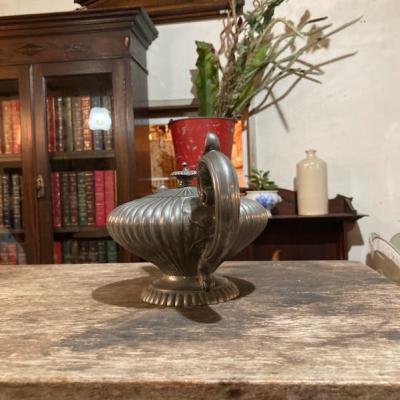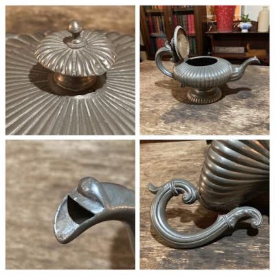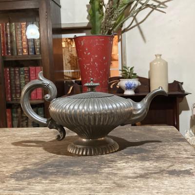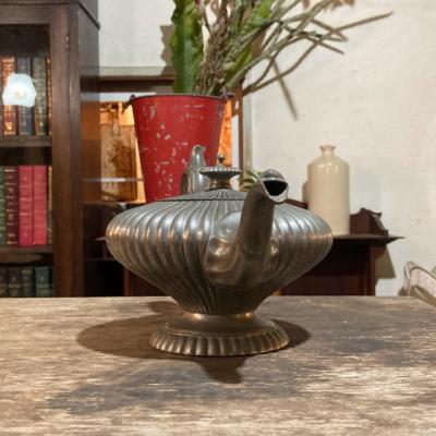 アラビアンナイトを思わせる美しいピューターポットが届きました。このポットは、持ち手や注ぎ口に至るまで細かい細工が施されており、見ているだけで心が和みます。底には数字の刻印が入っていました。内側には黒ずみが見られますが、これはアンティークならではの風合いを残すため、そのままにしてあります。このピューターポットは、お部屋を飾るアイテムとして、独特の雰囲気を醸し出し、空間を一層魅力的にしてくれることでしょう。ピューターは柔らかいため小さな傷や凹みを含みますが、アンティークらしいたたずまいをお楽しみください。イギリス製、年代不詳。