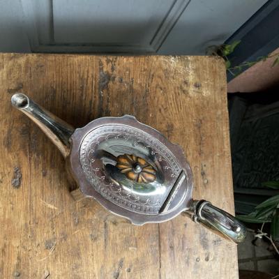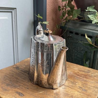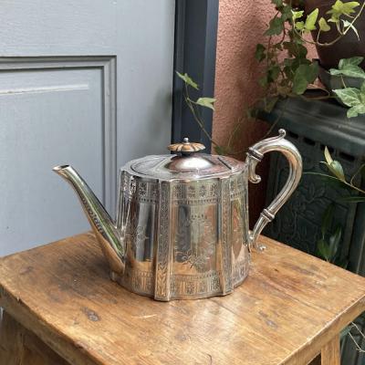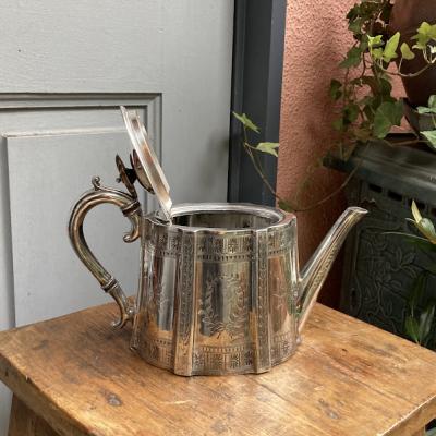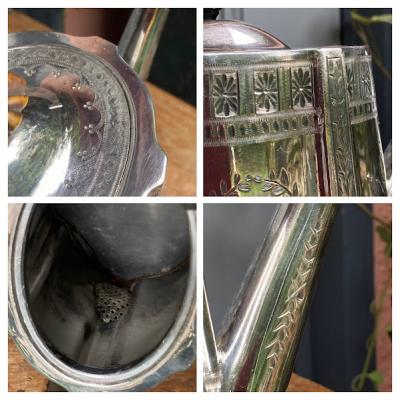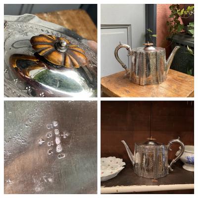 繊細で美しい模様が刻まれたティーポットが届きました。側面に大きな傷もなくたたずむ様子は、長く大切に使われていたことを物語っています。底に刻印と数字が刻まれていますが、一部消えかかっているため判別はできませんでした。内側は若干の使用感がありました。イギリス製、年代不詳。光に反射してきらめく様子は、お部屋に彩りを添えてくれることでしょう。