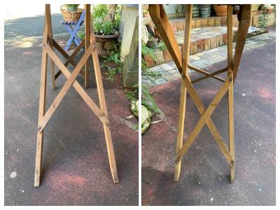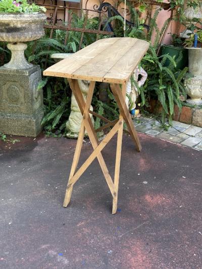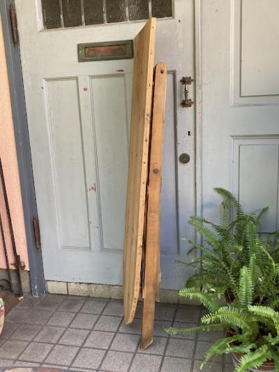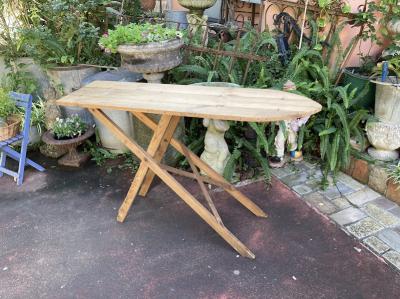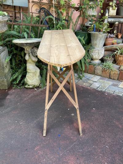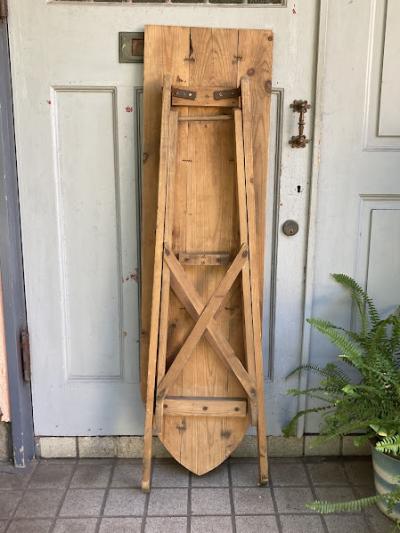 ディスプレイ台や作業台としても使えるアイロン台が届きました【44-261-2】折りたたむと約9cmになりコンパクトに収納できます。天板長さが122㎝とやや大きめのサイズ感です。テーブルクロスをかければイベントやキャンプで簡易テーブルとしてもおしゃれに使えますね。イギリス製、年代不詳。ビンテージ品のため小さな傷や凹を含みます。