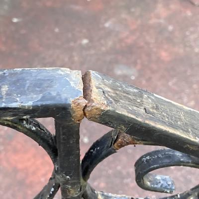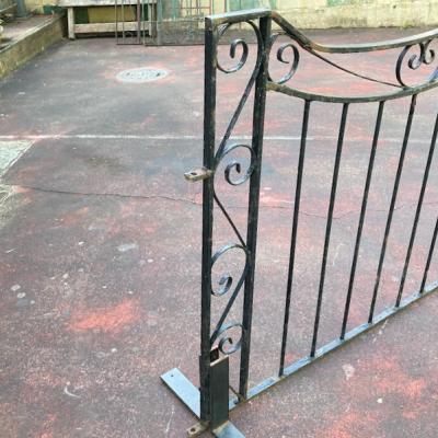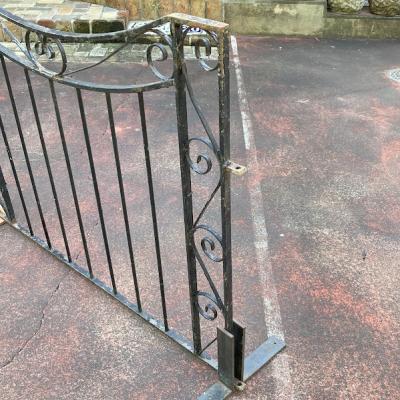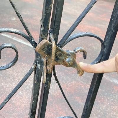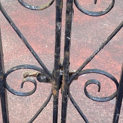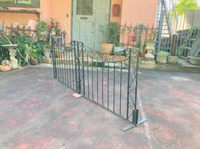中央に向かいなだらかな曲線を描く両開きのアイアンゲートが届きました【44-251A】左右ペアのセット。大きなサイズをお探しの方におすすめです。左右のサイドには上下2か所に固定用の穴が付属。(穴径約1㎝)、中央に左右を固定する可動式のフックと、下向きに固定する金具が付属しています。片方の上部に一か所3mmほど欠けている部分があります。拡大した画像をご確認ください。大人の力でグッとつかんでも動きませんが、こちらがあるため価格に反映させてあります。推定1930年代、イギリス製。アンティークらしい錆、ペイントの剥がれ、傷を含みますが歴史を感じる存在感を楽しめます。取り付けをご検討の方は、ご自身の契約されている施工業者さまにお問合せくださいね。福岡市南区の店舗にてお渡しもできますのでお気軽にどうぞ!