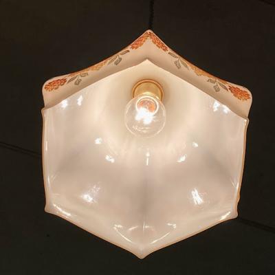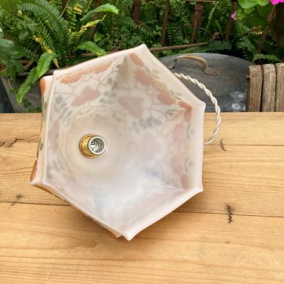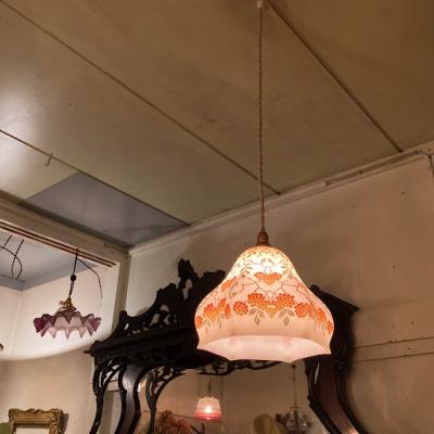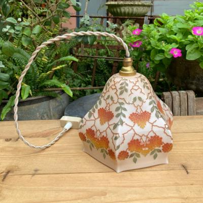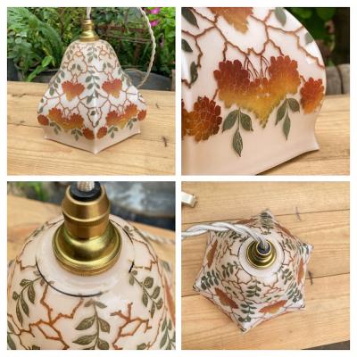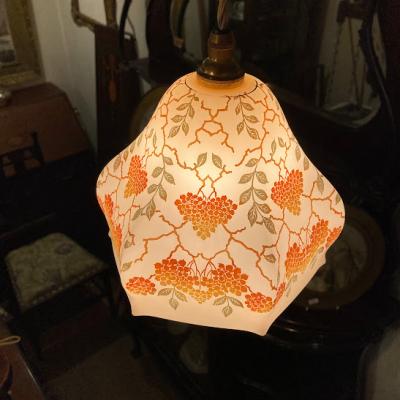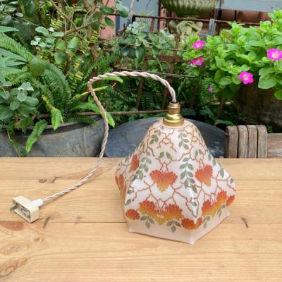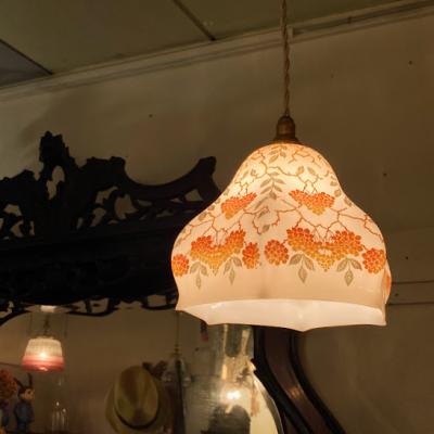 咲き誇る小花のシルエットが美しいガラスシェードが届きました【44-204】イギリス製、推定1940年代。明かりをつけない日中でも、描かれた落ち着いたデザインが華やかにお部屋を彩ってくれます。上部に少し剥がれがありますがあまり目立ちませんのでご安心ください。