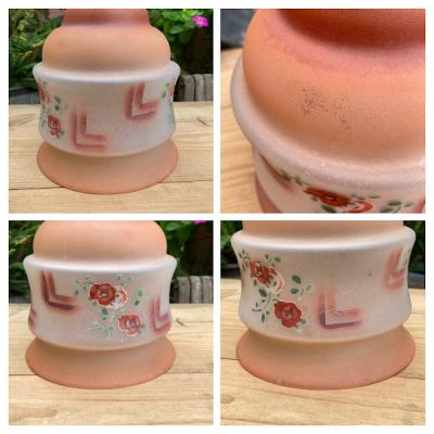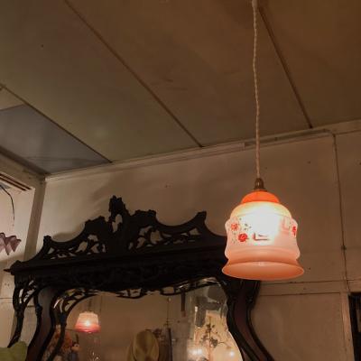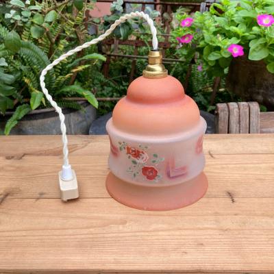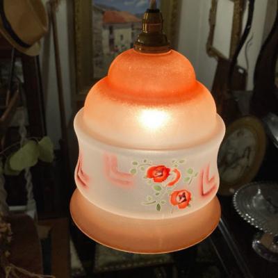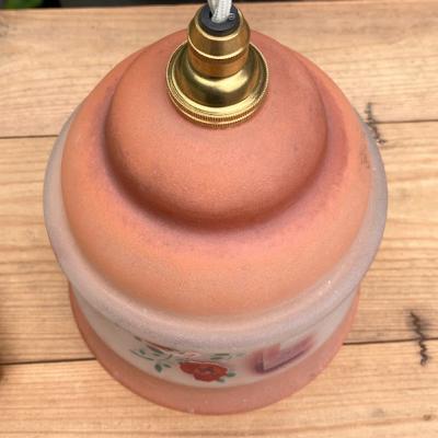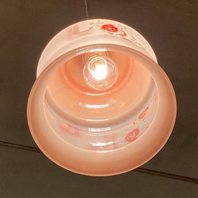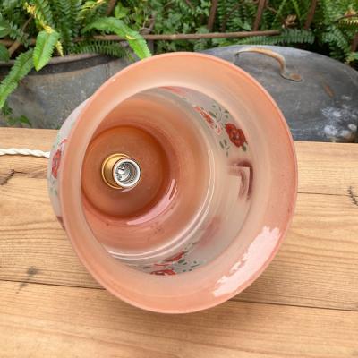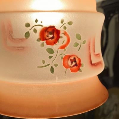 マットな質感にレトロな雰囲気のバラが愛らしいガラスシェードが届きました【44-211】頑張りすぎないポップな絵柄は、昼間の明かりが点いていない時でもほっと癒されますね。外側のざらりとした印象に比べ、内側はつるんとした作りです。ほんわかした空間を演出したいお部屋におすすめ!