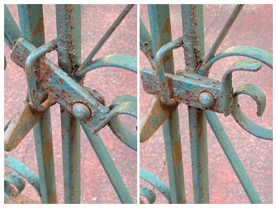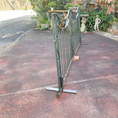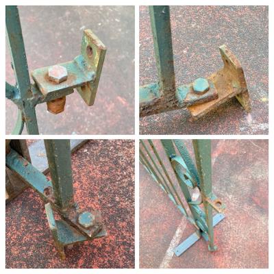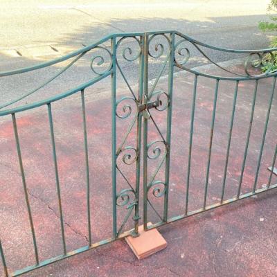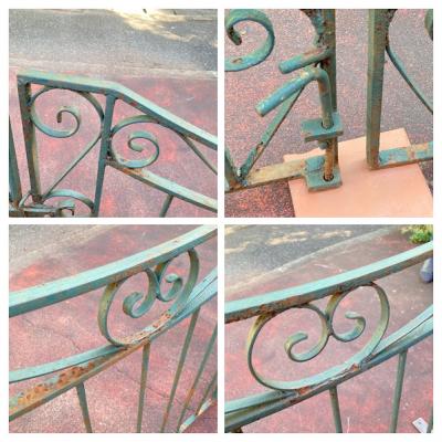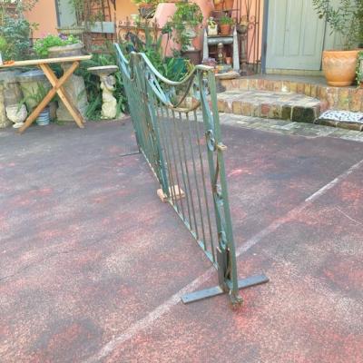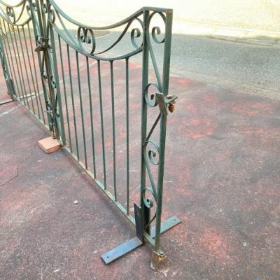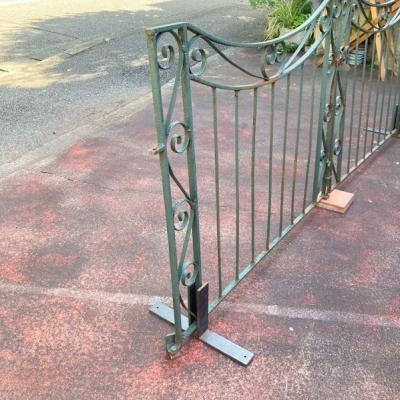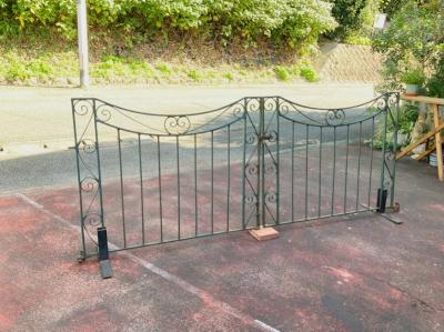 グリーンにペイントされ曲線を描く両開きのアイアンゲートが届きました【44-252G】左右ペアのセット。全長233㎝ありますので、大きなサイズをお探しの方におすすめです。左右のサイドには固定用のプレート可動式が3か所、穴のみ(径3.5㎝)が1か所付属。中央に左右を固定する可動式のフックと、落とし棒(下向きの棒)が付属しています。推定1930年代、イギリス製。アンティークらしい錆、ペイントの剥がれや傷を含みますが、それらがあることで時代を感じさせてくれる証となります。取り付けをご検討の方は、ご自身の契約されている施工業者さまにお問合せください。福岡市南区の店舗にてお渡しもできますのでお気軽にどうぞ!※撮影に使用したスタンドは付属しません