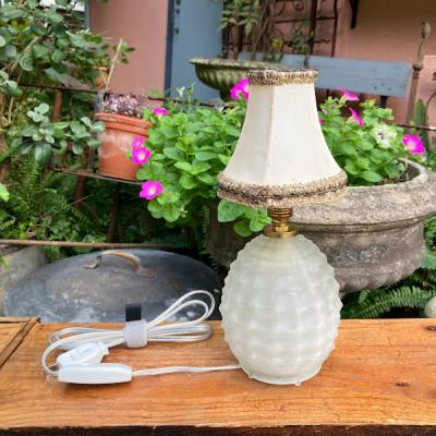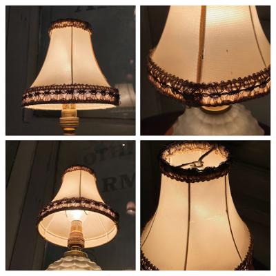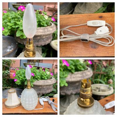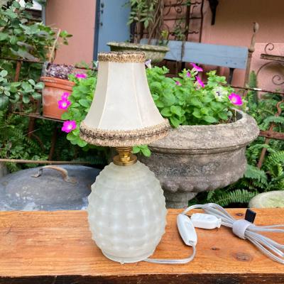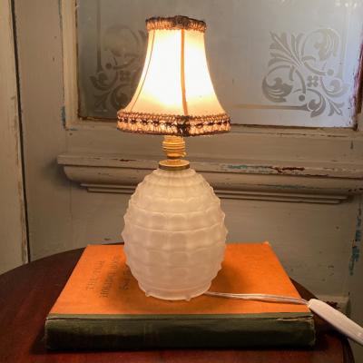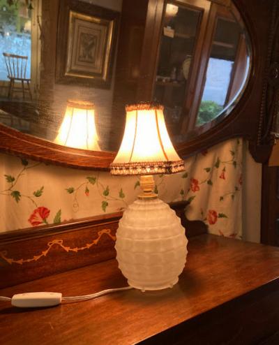 まるで香水瓶のようなフォルムの小さな卓上スタンドが届きました【44-202】小さなシェードが乗った、愛らしい雰囲気を醸しだす照明です。イギリス製、推定1940年代とのこと。電球は海外仕様のB15サイズを使います。コード、スイッチは日本の新しいものと交換済み。本体ガラスの内側や布シェードに小さな傷を含みますが、アンティークの証としてお楽しみください。ベッドサイドやお気に入りのコーナーをほんのり照らす照明をお探し方におすすめ。点灯確認用の電球はシャンデリア球25Wをお付けしていますが、お好きな明るさの電球に交換してご使用ください。福岡市南区の店舗にてお渡しもできますのでお気軽にどうぞ!