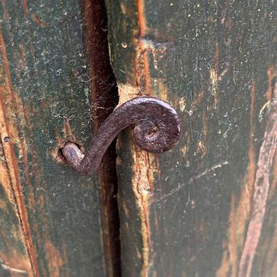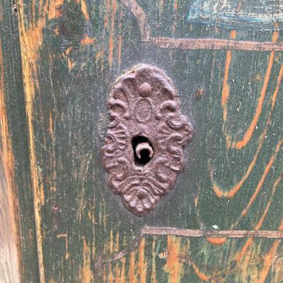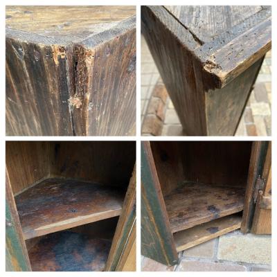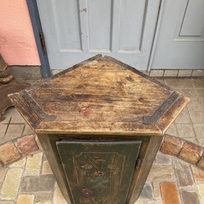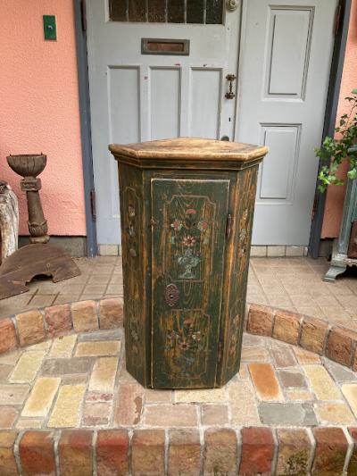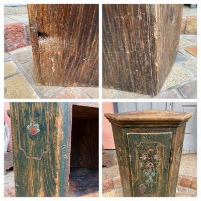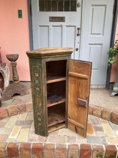使い込まれたコーナーキャビネット【38-32】オールドパインをグリーンにペイントし可愛らしい花柄が描かれています。セラーによるとフランスかハンガリー製ではないかとのことでした。推定1920年代。金具のサビ具合とペイントの剥がれ具合がシャビ―シックな雰囲気です。鍵穴がありますが、鍵は付属しておらず機能しませんので飾りとしてお考えください。正面の左上に小さな金具が付いており、こちらを動かすことで扉を固定することができました。デッドスペースになりがちなコーナーを有効活用でき、雰囲気のあるキャビネットをお探しの方におすすめ
