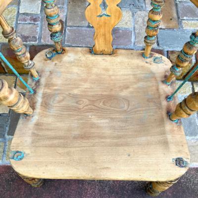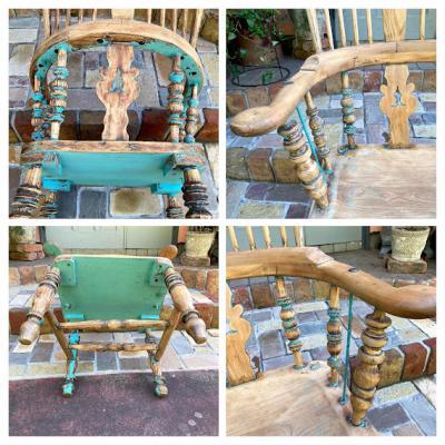 一見すると古いウインザーチェアですが、裏面を返すと鮮やかなターコイズブルーにペイントされ、ひじ掛け部分も2か所金属で補強されていました。推定1900年代。英国では修理をしながら大事に長く使用し続けることが多いため、いつの時代の職人さんか、またはDIY好きのお父さんの手仕事かと思われます。何度もペイントされては、はがした跡がこ椅子の風合いにつながっていると思うと面白いですね。店長が一目ぼれして買い付けたものです。もちろん腰掛けることもできますが、強度などの兼ね合いから展示向きとなります。ワンポイントで観葉植物や古い洋書、イギリスらしいタータンチェックのブランケットなどを飾っても。ご覧いただけるとおり傷やリペアの跡がしっかりとありますので、ジャンクな雰囲気が好きな方、撮影などの家具をお探しの方、お店などにディスプレイをお探しの方におすすめ。ピカピカの新品をお求めの方はご遠慮ください。