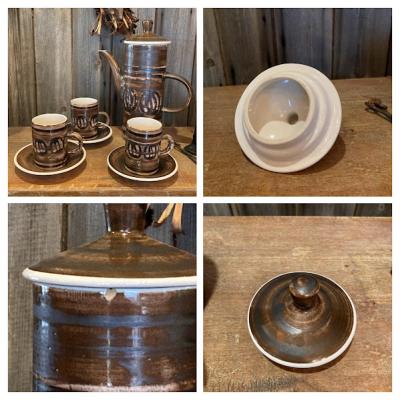 素朴なたたずまいのコーヒーポットが届きました【43-314B】イギリスではなじみのある細長い形のポットです。この形状から花瓶として使う方も多いですよ。1956年にデビット・シャープとジョージ・グレイで創立。1980年代まで多くの製品で成功を収めましたが惜しまれつつ2007年に閉鎖されました。こちらのシリーズは欧州で人気がありコレクター間で高く評価されているそいうです。1960年代、イギリス製。持ち手の上にあるフチに4㎜ほどのカケがあるので価格に反映させてあります。福岡市南区の店舗にてお渡しもできますのでお気軽にどうぞ!