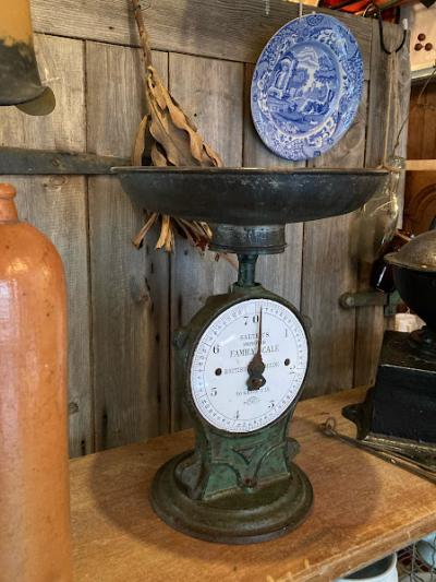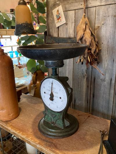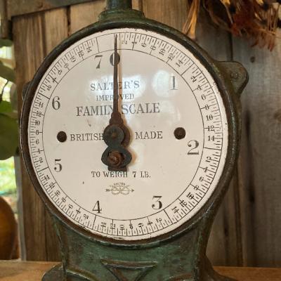 アンティーク雑貨好きに人気のSALTER社スケール(量り)が届きました【44-360】こちらはやや大きめの7LB(約3.1kg)まで対応のサイズ。取り外しができる大きなトレイが付いています。ずっしりと重みのある鉄製で深みのある緑色が時代を感じさせてくれますね。トレイに小物や植物を飾ることができ、デザイン性も兼ね備えている優れものです。あなたの生活に彩りを添えるパートナーになってくれるでしょう。イギリス製、1900年代