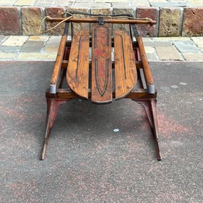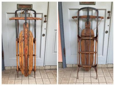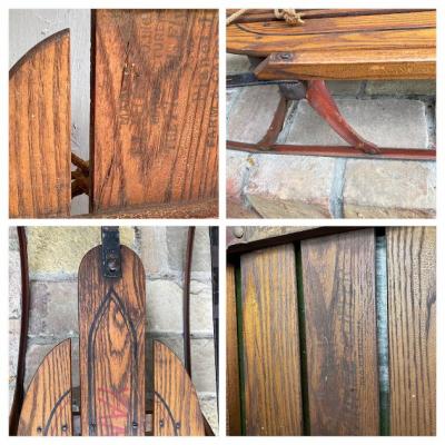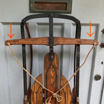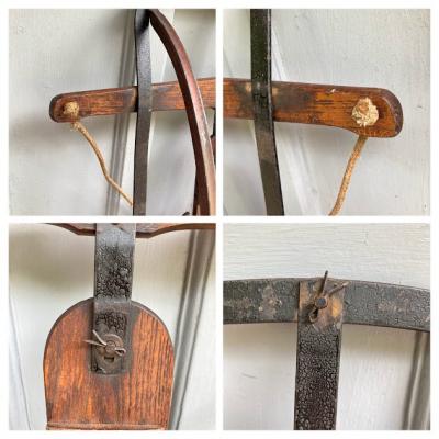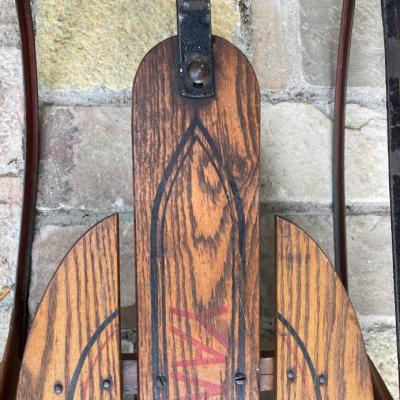 1950年代ビンテージ「YANKEE CLIPPER」ロゴ入り。made in USA。しっとりとした風合いの木の部分と、鮮やかな赤い色が残るアイアン部分のコンビネーションがとてもカッコいいお品です。矢印で示している部分は可動式になっており、左右に曲がりやすいよう設計されています。裏面に1か所現地補修の跡がありましたが、経年により色味が馴染んでいるためあまり目立ちません。安全面を考慮して、ソリとしてのご利用ではなくビンテージ感あふれるディスプレイアイテムとしておすすめ。店頭では天井に吊るしたり、他の商品を飾る棚としても面白いですね