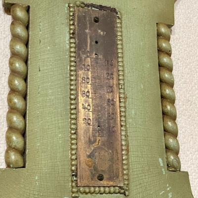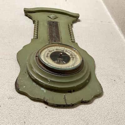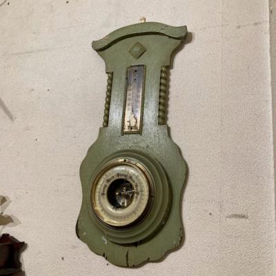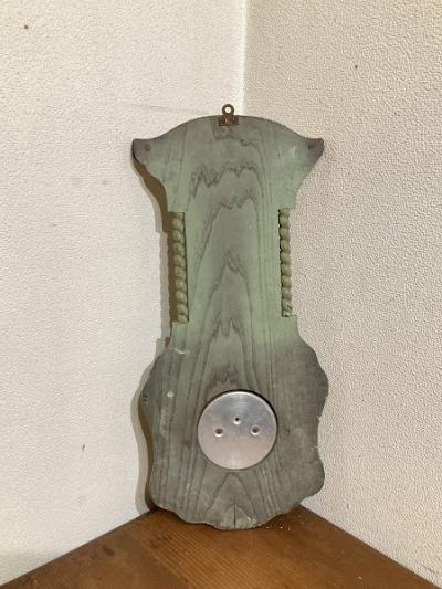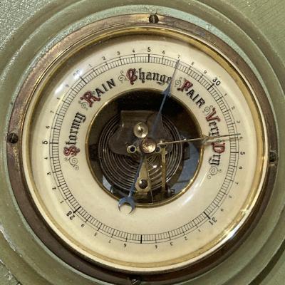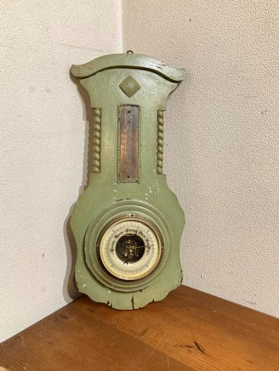 アッシュグリーンにペイントされたアネロイドバロメーター(気象計)が届きました【24-GR】かつては温度や気圧を測定し天候を予想していたそう。残念ながら本来の気象計としての機能や上部の温度計は外れてありませんが、ペイントの剥がれやパーツの使い込まれた雰囲気がお部屋のインテリアとして素敵です。撮影小物などにもおすすめですよ。年代不詳