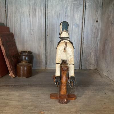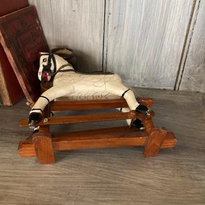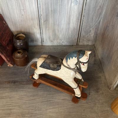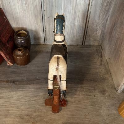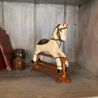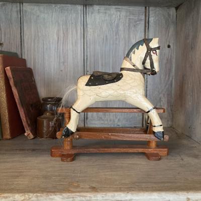 18㎝ほどの小さなロッキングホースが届きました【44-416】馬具はしっかりとした革を使用し、現在でも馬と生活を共にするイギリスらしいお品です。土台の部分は前後に動くようになっています。しっぽの毛が抜けていますが、長く大切に使われていた証ですね。手作業で造られた素朴なたたずまいは、ホッとした気持ちにさせてくれますね。イギリス製、年代不詳。本棚やお気に入りのコーナーに飾ってお楽しみいただける方におすすめ★送料無料★