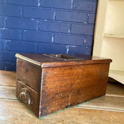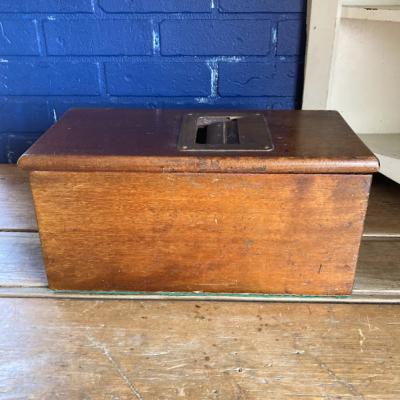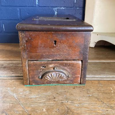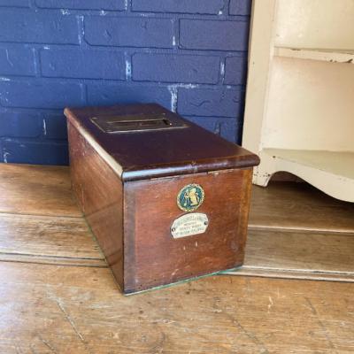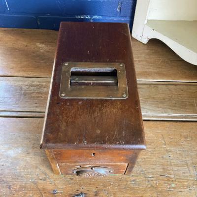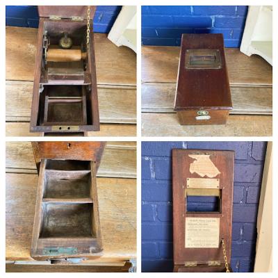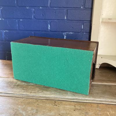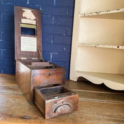 このレジが造られた1837年から1901年の期間はヴィクトリア女王がイギリスを統治しており、産業革命による発展が絶頂期だったといわれています。美しい木目に包まれたこのレジで数多くのやり取りを行ったことでしょう。鍵穴はありますが、カギはありませんでした。引き出しはすべてを引き出してから、元の位置に戻るように設計されています。上蓋の内側には特許商品であること、取り扱い説明文が貼られています。特別なレジとしてお使いいただいてもいいですし、自分だけのお気に入りを入れるボックスとしても楽しめますね