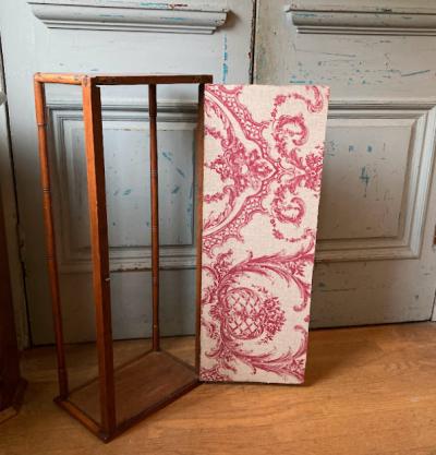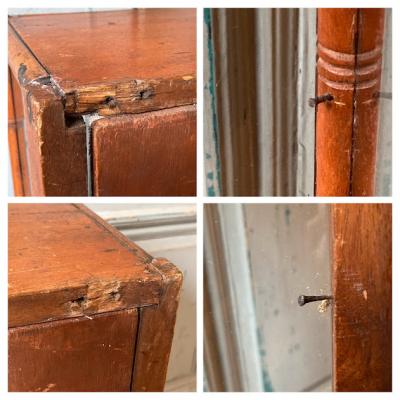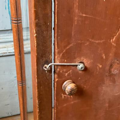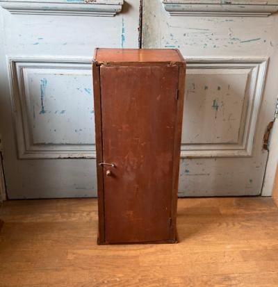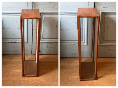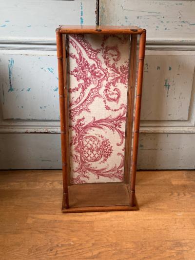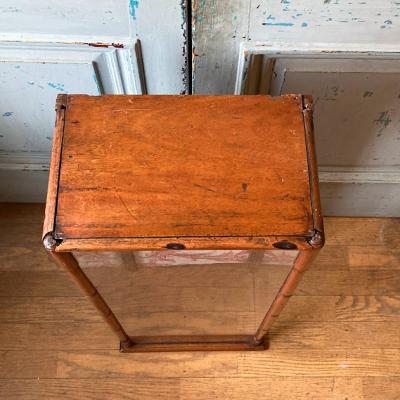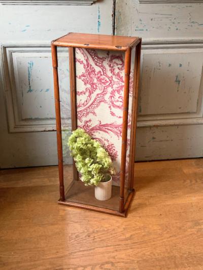 このガラスケースは、艶やかなマホガニーを使用しており、イギリス製で推定1920年代のものです。背面の扉から出し入れでき、奥行が約20㎝程度と省スペースでのディスプレイが可能です。背面にダメージが見られたため、ビンテージ生地を貼ってあります。棚板は付属していませんが、下から約21㎝と約49㎝の位置に古い小さな釘が4か所ずつ取り付けてあったため、小さな棚板が付属していたと推察されます。あまり重い物は難しいかもしれませんが、透明のガラスやアクリル板などで棚板を2枚造れば3段のディスプレイができそうですね。上部には金具を取り外したとみられる箇所がありますので、倒れないように固定されていたようです。当時の人々が物を大切に扱っていたことが伺い知れますね。お気に入りのアイテムを飾るケースをお探しの方、店舗で省スペースのガラスケースが欲しい方におすすめ