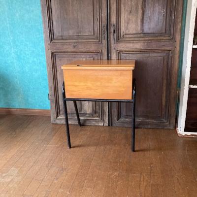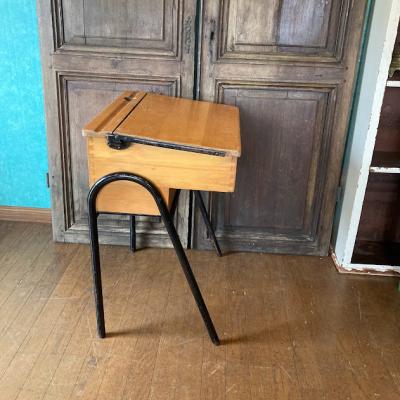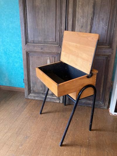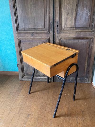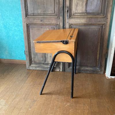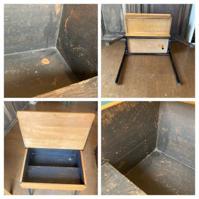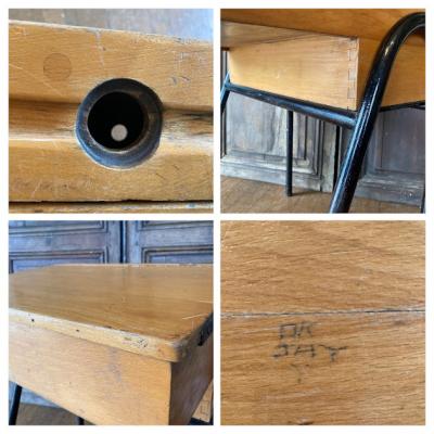 収納たっぷりのスクールデスク。イギリスの学校で使用されていたそう。推定1950年~60年代。多くの学生が書いた落書きや小さな傷は、学生時代を思い出し、ちょっとほっこりした気持ちにさせてくれますね。天板がやや斜めに設計されており、長時間の学習でも疲れにくいように配慮されています。天板にあるインク瓶を入れるための穴は、中の収納部分まで貫通しているためパソコンのケーブルをスマートに隠すことができそうです。穴にサイズ感の合う瓶などを入れれば、小さなペン立てや一輪挿しにも使えそうですよ。ハンドメイドや読書、リモートワークや、リスキングを始めた方にもおすすめ