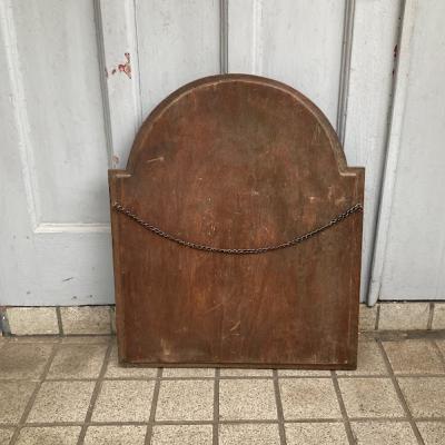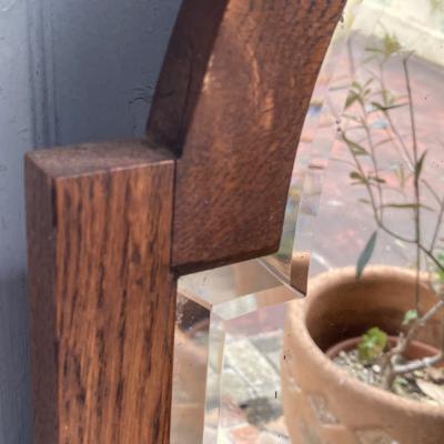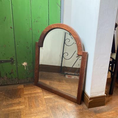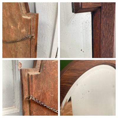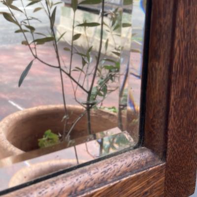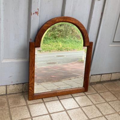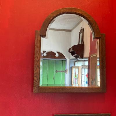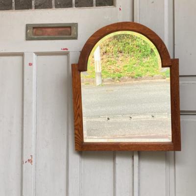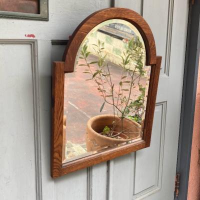 シンプルなオーク材の壁掛けミラーが届きました【44-230】直線と曲線の組み合わせが面白いデザインで、鏡のフチは斜めにカットされています。アンティークの鏡特有の黒いツブツブが見られますが、長い年月を過ごした証としてお楽しみください。玄関や洗面台、お手洗いなどに使いやすいサイズ感です