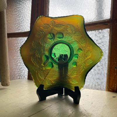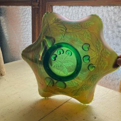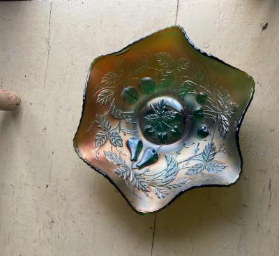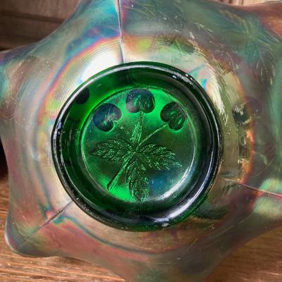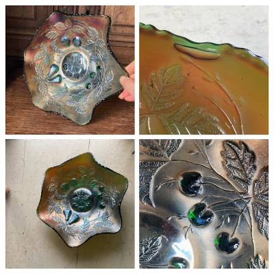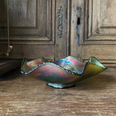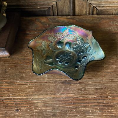 1895~1924年にアメリカで量産されたプレスガラスで、1950~60年代にブームとなりました。カーニバルで景品として使われたことからその名が付いたと言われています。中央や周りの果実の部分は緑のガラスが透けて見え、幻想的な雰囲気を楽しめます。そのまま飾っても十分楽しめますし、果物やお気に入りの小物をいれる定位置としてもいいですね。イギリスにて買い付けましたが、フェントン社のものと思われます。古いガラス特有の気泡も含みます。福岡市南区の店舗にてお渡しもできますのでお気軽にどうぞ!