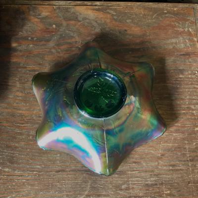 シャボン玉のような虹色が表面を覆いパールのような輝きを放つ鮮やかなカーニバルガラスの器が届きました【33-125】
