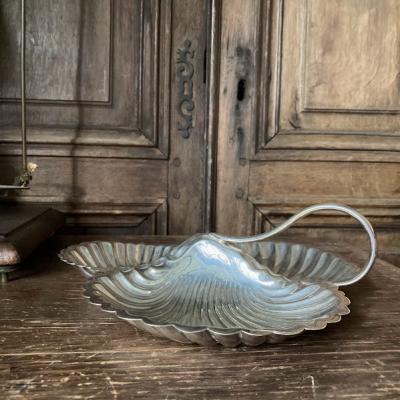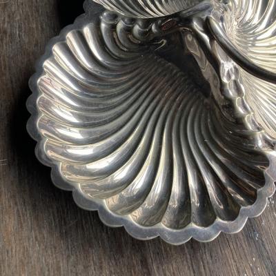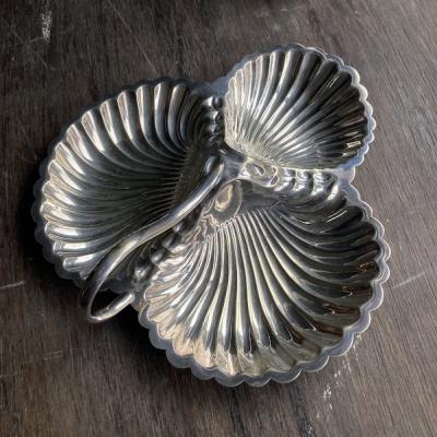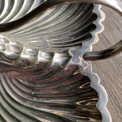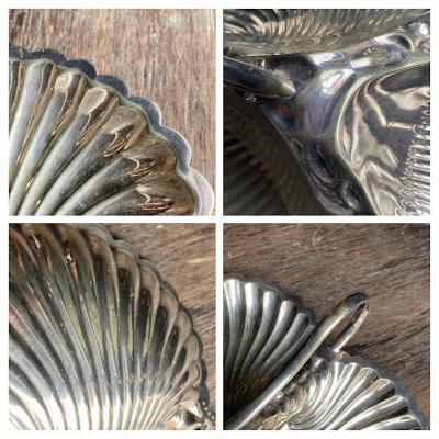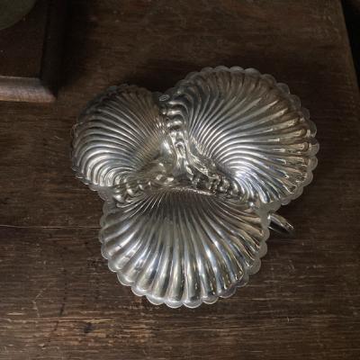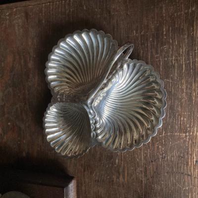 ミロのビーナスの貝殻のような美しいデザインのサービングプレート【45-08】が届きました。細やかなラインが重なり合いキラキラと光を反射します。裏面に数字とロゴが刻印されています。持ち手の部分やテーブルに接する部分は少し色が変化していますが長く大切に使われていた証です。毎日使うアクセサリーやお気に入りの小物を飾ってお楽しみください。イギリス製。福岡市南区の店舗にてお渡しもできますのでお気軽にどうぞ!