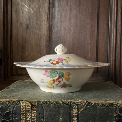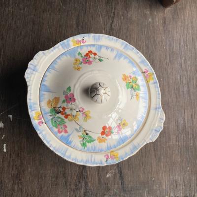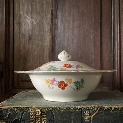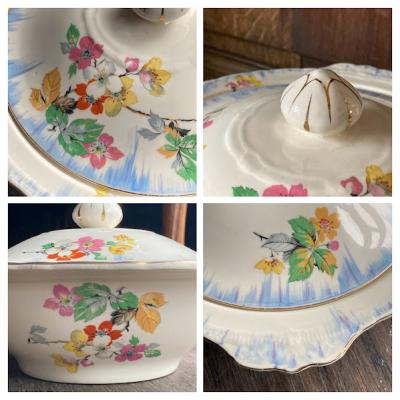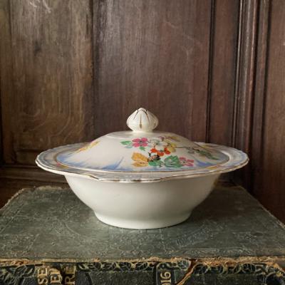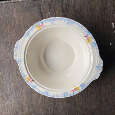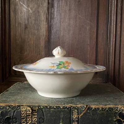 カラフルな桜を描いたチュリーンが届きました【44-364】チュリーンとは、もともとスープや野菜をいれていた蓋つきの容器のことです。左右に伸びた持ち手がスッキリとしたデザインで置いておくだけでも楽しめるお品ですが、季節のお花を飾る花器や、お気に入りの小物をいれる入れ物として楽しめますね!裏にはHOLLINSHAD&KIRKHAM TUNSTALLのスタンプあり。1933年~1942年。この会社は1870年代にイギリスのバースレムで創業後、さまざまなパートナーと組みながらフルーツやアールデコの絵柄を得意とする会社で、今でも世界のコレクターに愛されているそうです