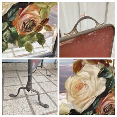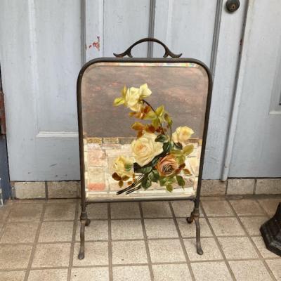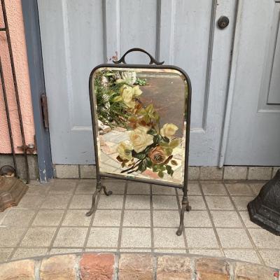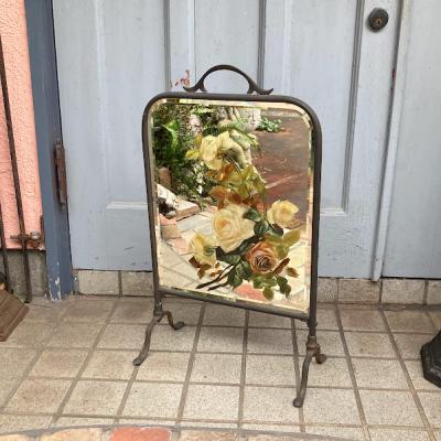 イングランドの国花であるバラが手書きで描かれた、美しいファイヤーフェンス(スクリーン)【43-253】が届きました。このアイテムは、暖炉を使わない季節には暖炉内を隠し、使用時には暖炉の熱が直接人に当たるのを防ぐ実用的な品です。現在ではお部屋のちょっとした仕切りや、おしゃれな衝立としても素敵に活躍してくれるでしょう。鏡部分はフチが立体的にカットしてあります。フレーム部分は真鍮、裏面は銅のようで、ビクトリア時代の趣を色濃く残すたたずまいです