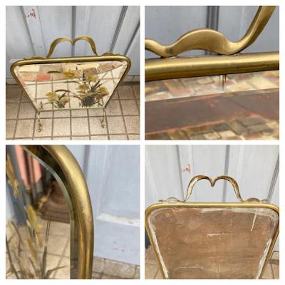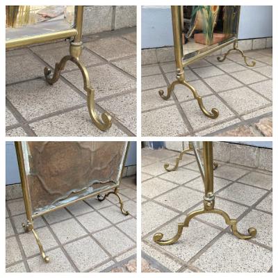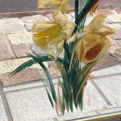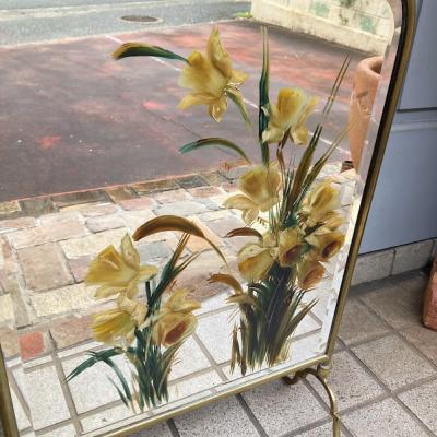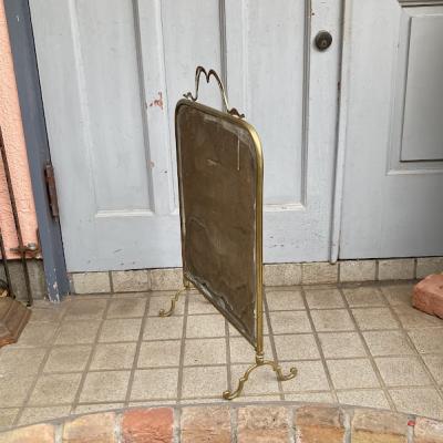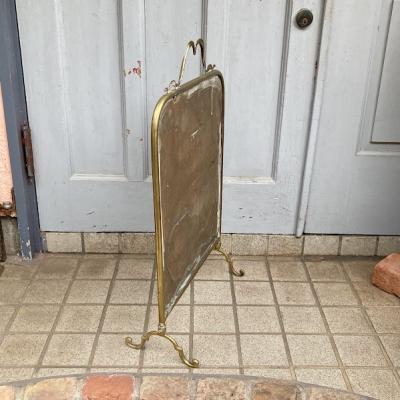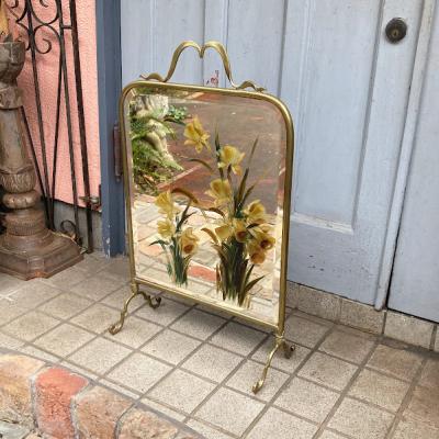 ウェールズの国花である水仙を手書きで描いた美しいファイヤースクリーンが届きました【43-146】イギリスではお庭や公園で水仙が咲き始めると春の訪れを感じ喜びを覚えるそうです。このアイテムは、暖炉を使わない季節には暖炉内を隠し、使用時には暖炉の熱が直接人に当たるのを防ぐ実用的な品です。現在ではお部屋のちょっとした仕切りや、おしゃれな衝立としても素敵に活躍してくれるでしょう。左下の部分に小さなヒビが入っていますが、現地で固定された跡がありますのでこれ以上は割れないようにしてあります。鏡のフチは立体的にカットしてあります。フレーム部分は真鍮、裏面は銅のようで、ビクトリア時代の趣を色濃く残すたたずまいです