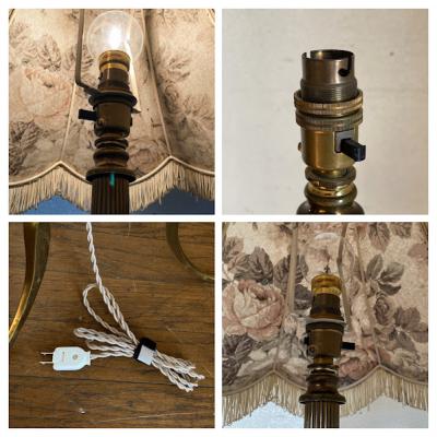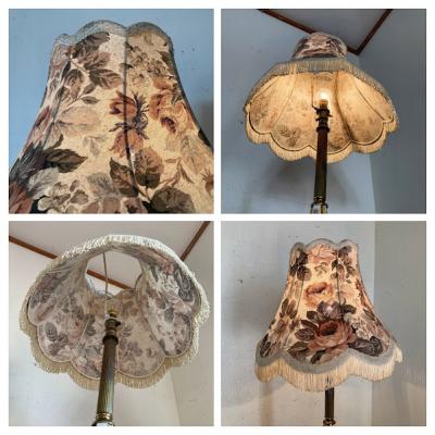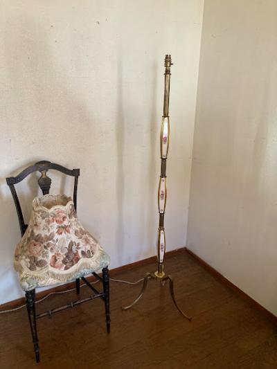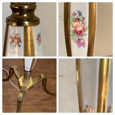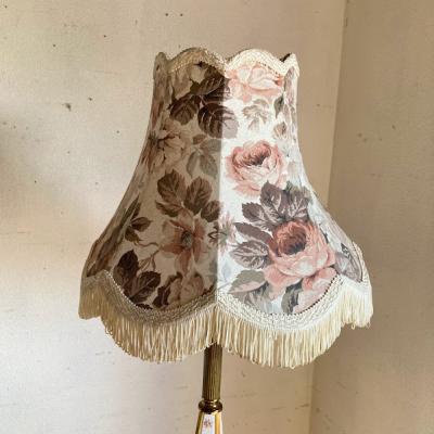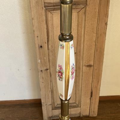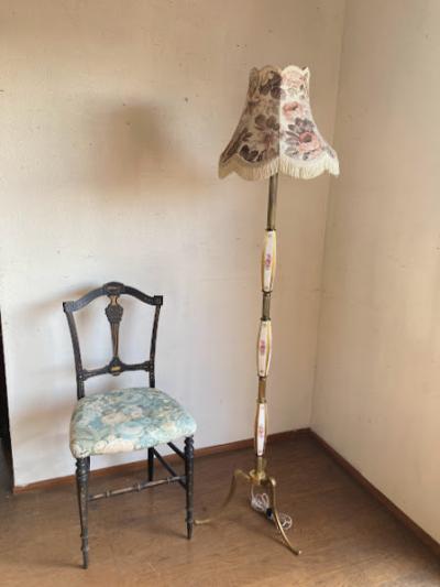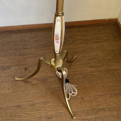 鮮やかなバラに包まれたフロアスタンドが届きました【44-312】本体の部分は艶やかな陶器と真鍮で連結されており側面には可憐なバラが描かれています。陶器製のため貫入と、あまり目立ちませんが2mmほどの小さなカケがあります。サイズ感がわかるようにサンプルの古いシェードをつけてありますが、少しゆがみがあり黒いシミが見られます。必要な方にはおまけで付属しますが、ダメージがあることを予めご了承ください。必要ない方には本体のみお送りしますので、ご要望欄にシェードが必要かどうかご記入ください。フランス製、推定1940年代。
