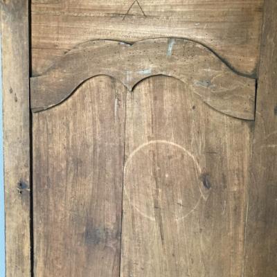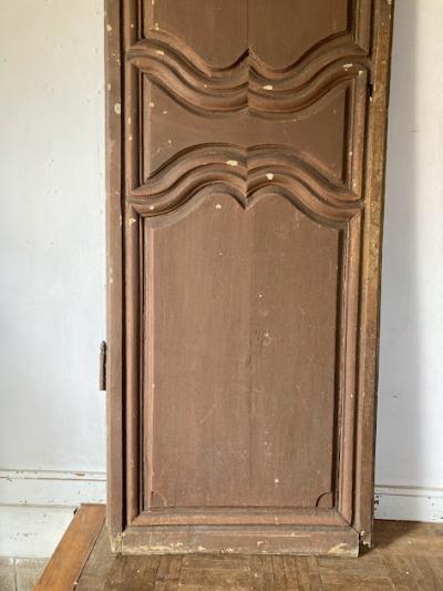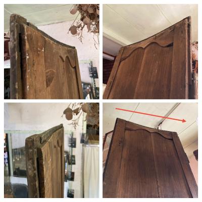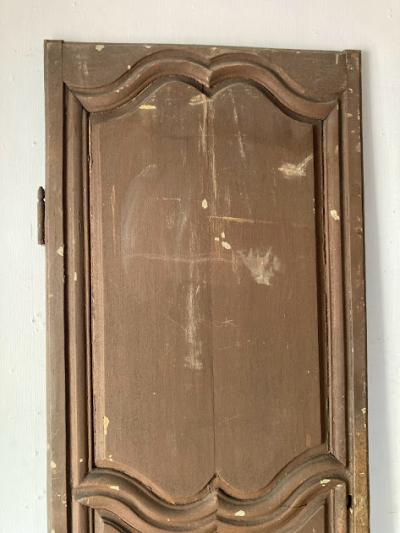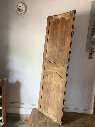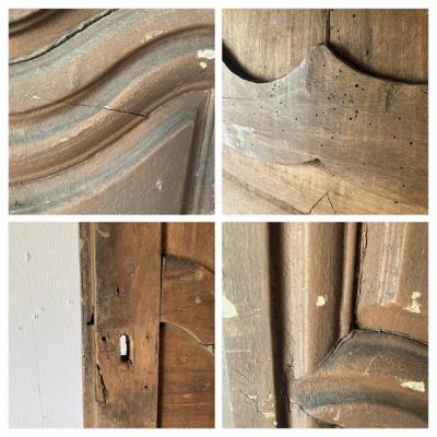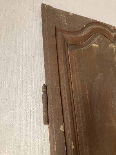 使い込まれた質感が素敵なフランスのドア。推定1920年代とのこと。ドアとしてはもちろんですが、店舗などの内装パネルや展示台としても活躍しそうです。虫食いの跡やペイントの剥がれも含め、時代を感じる雰囲気をお楽しみいただける方向き。一人でも持ち運べる重さですので、お部屋の壁面インテリアとしても使えそうですね。古いお品のため中央部分にソリがあります。赤矢印部分をごらんください。
