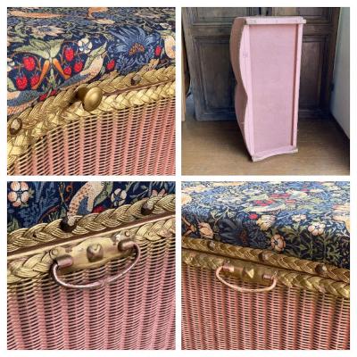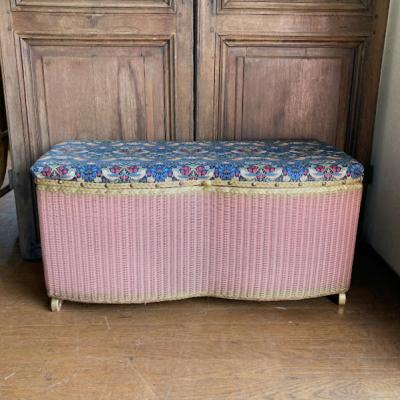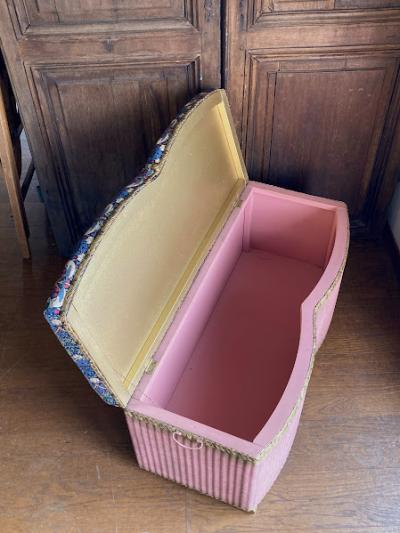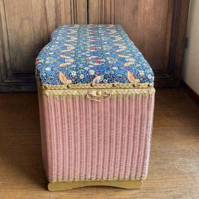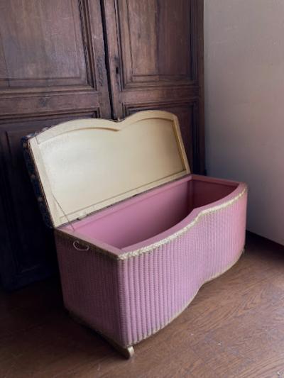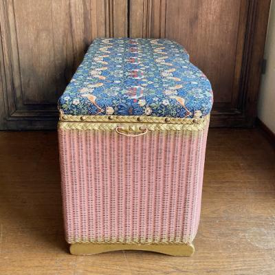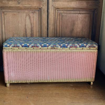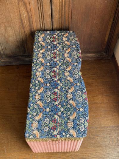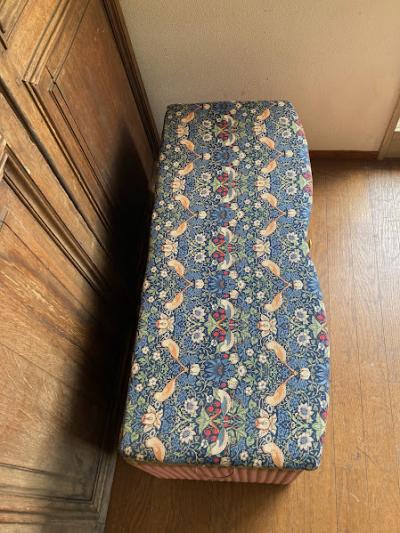 たっぷりと収納ができるロイドルームボックスが届きました【42-118】座面はウイリアムモリスの「いちご泥棒」の柄に張り替えました。イギリスではブランケットボックスとして使われていたそうですが、おもちゃや小物をまとめる入れ物としても活躍しそうですね。スツールとしても使えお部屋を広く利用できますね。推定1950年代、イギリス製。下の収納部分はビンテージ感のあるたたずまいが素敵です。左右に持ち運び用の取っ手、中央に蓋を開けるつまみがあります。サイズ感のわりには軽いので、一人での移動もラクチンですよ。福岡市南区の店舗にてお渡しもできますのでお気軽にどうぞ!